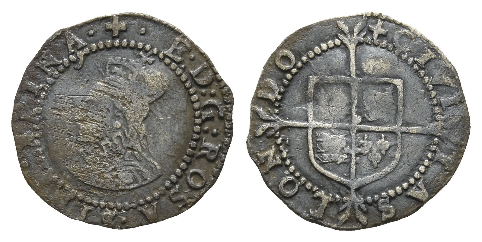 London (Tower) mint; i.m: Greek cross. Fifth issue; struck 1578-1579. + • E : D : G : ROSA • SINE • SPINA •, crowned bust to left, wearing ruff / + CIVI-TAS LON-DO, coat-of-arms over long cross fourchée. North 2001; SCBC 2575. 0.63gr, 15mm, 1h.