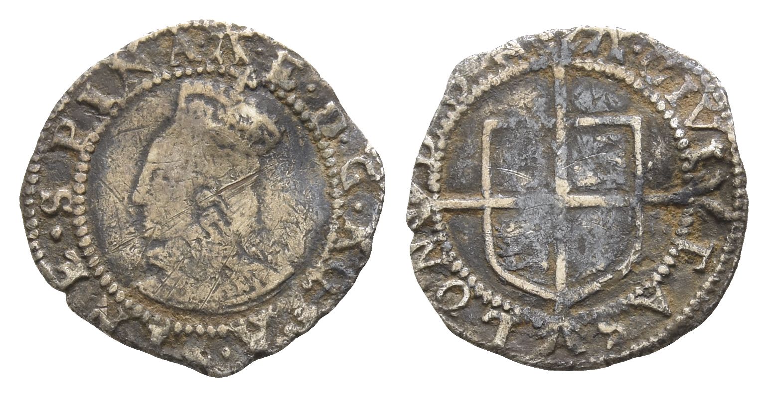 (A) • E • D • G • ROSA • SINE • SPINA •, crowned bust to left, wearing ruff / (A) • CIVI-TAS LON-DON, coat-of-arms over long cross fourchée. North 2017; SCBC 2580. 0.57gr, 13mm, 8h.