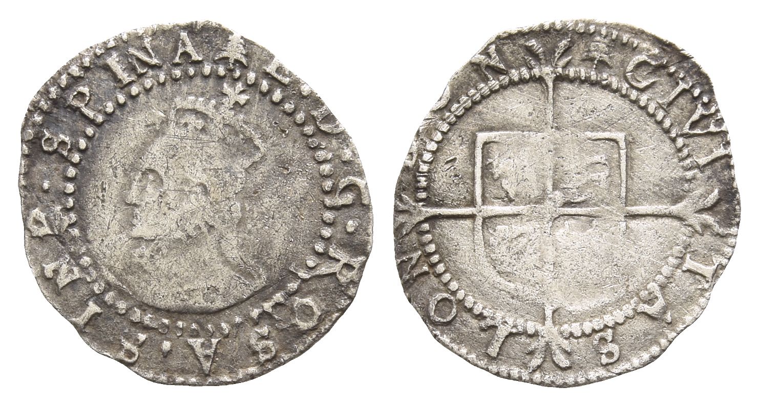 (Bell) E • D • G • ROSA • SINE • SPINA, crowned bust to left, wearing ruff / (Bell) CIVI-TAS LON-DON, coat-of-arms over long cross fourchée. North 2017; SCBC 2580. 0.44gr, 15mm, 1h.
