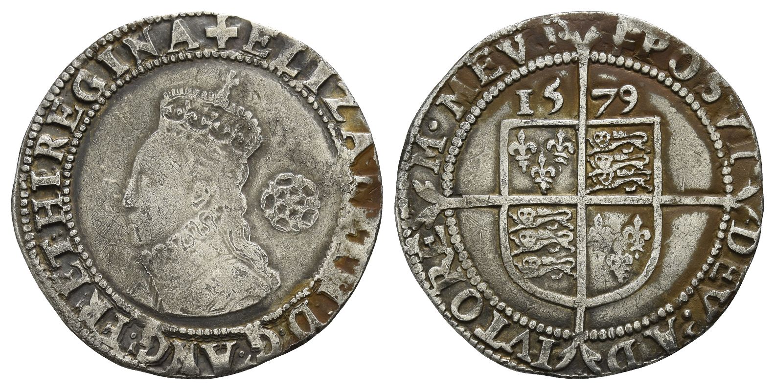 Tower (London) mint; i.m: Greek cross. Dated 1579. Fifth Issues. (Greek cross) ELIZABETH : D .' G .' ANG .' FR .' ET : HI .' REGINA, crowned bust to left, wearing ruff; rose behind / (Greek cross) POSVI DEV .' AD-IVTORE-M • MEV .', coat-of-arms over cross fourchée; date above. North 1997; SCBC 2572. 3.14gr, 26mm, 9h.