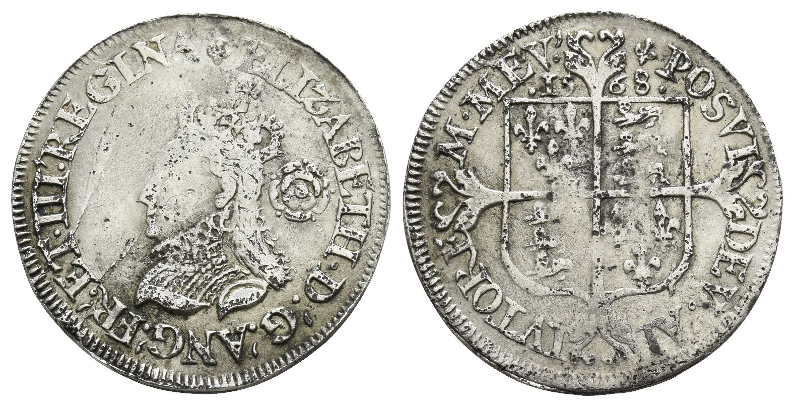 (Lis) ELIZABETH • D .' G .' ANG .' FR .' ET • HI .' REGINA, crowned bust to left, wearing ruff; rose to right / (Lis) POSVI .' DEV .' AD-IVTOREM • MEV .', coat-of-arms over long cross fourchée. North 2030; SCBC 2599. 3.09gr, 26mm, 6h.