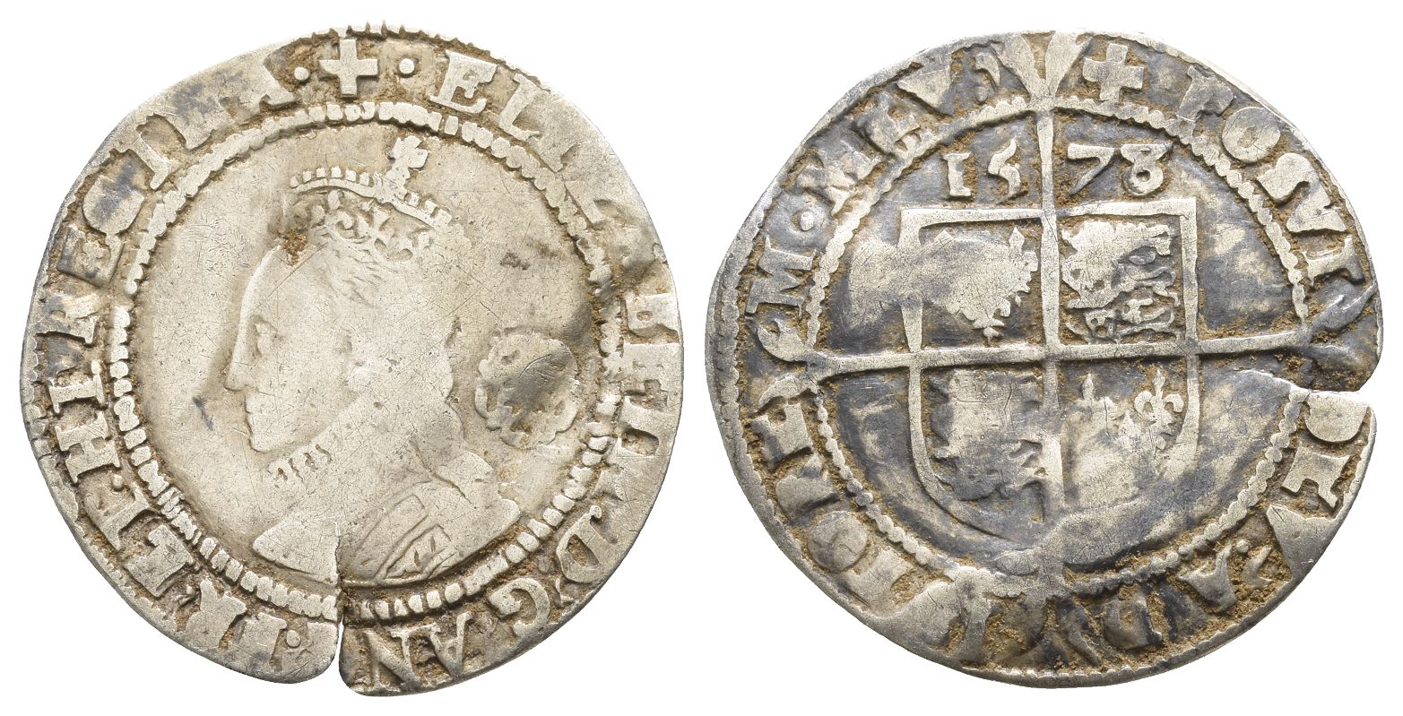 (Greek cross) • ELIZABETH : D .' G .' ANG .' FR .' ET : HI .' REGINA •, crowned bust 5A to left, wearing ruff; rose behind / (Greek cross) POSVI DEV .' AD-IVTORE-M • MEV .', coat-of-arms over cross fourchée; date above. North 1997; SCBC 2572. 2.83gr, 26mm, 3h.