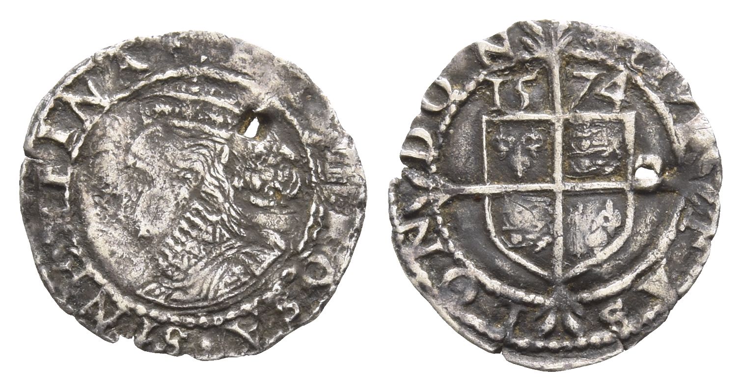 England. Tudor, Elizabeth I AR Threefarthings. Dated 1574. London (Tower) mint; i.m: eglantine. Third issue.
