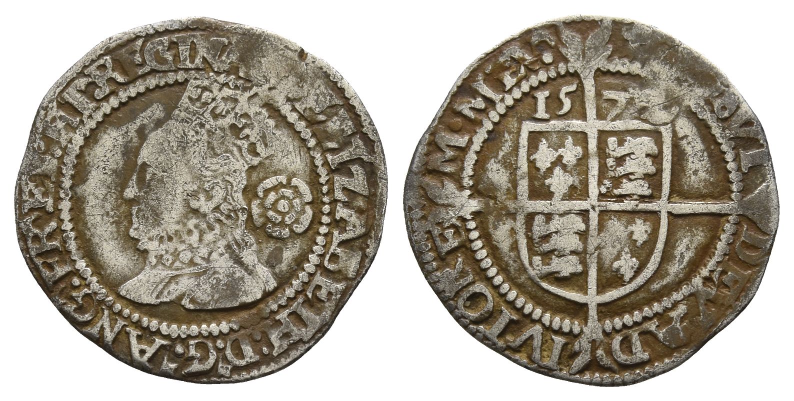 Tower (London) mint; i.m: ermine. Dated 1572. Fourth issue. ELIZABETH : D .' G .' ANG .' FR .' ET : HI .' REGINA, crowned bust to left, wearing ruff; rose before / POSVI DEV ADIVTOREM • MEV .', coat-of-arms over long cross fourchée. North 1998; SCBC 2566. 1.44gr, 19mm, 10h.