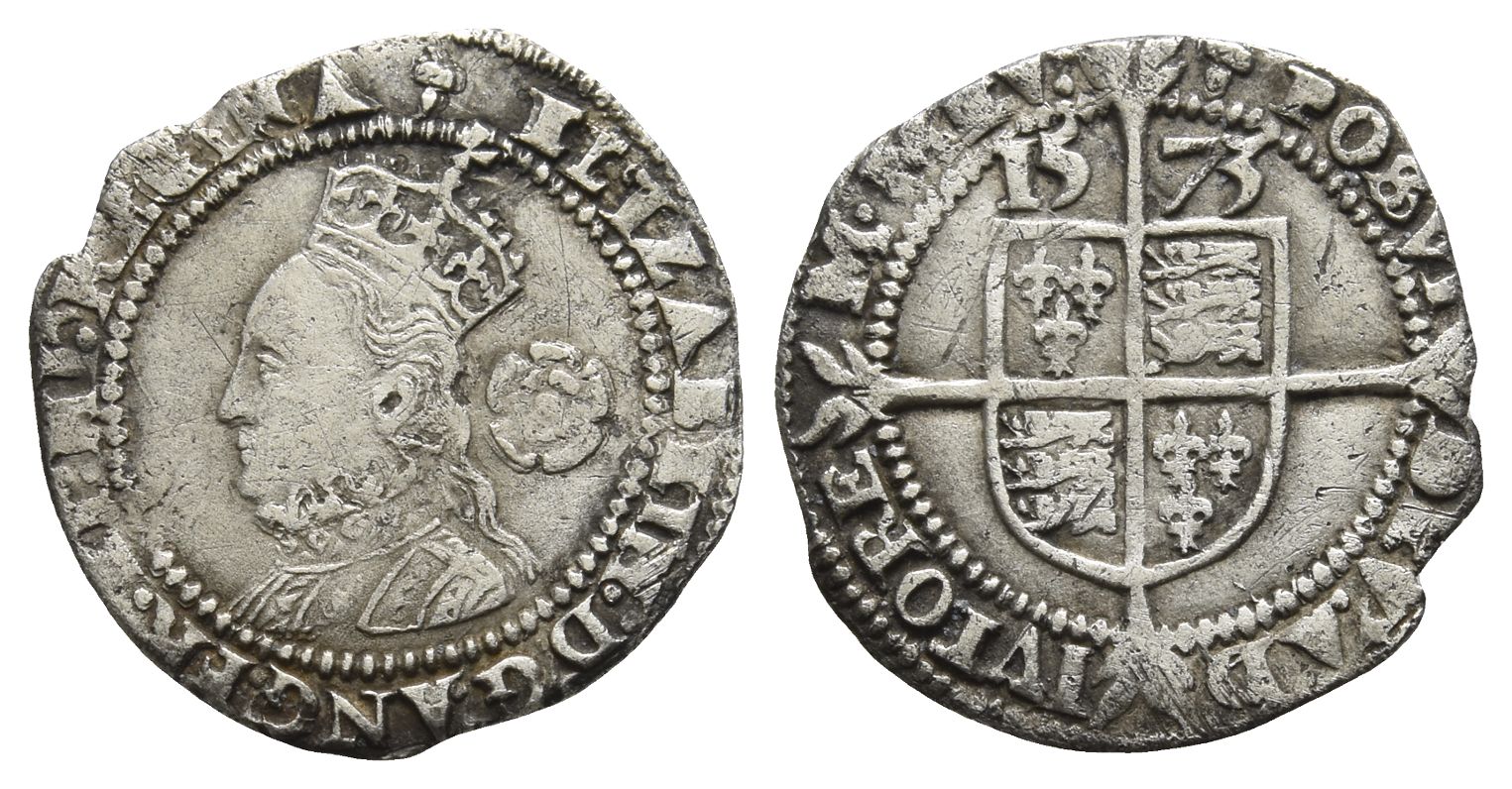 Tower (London) mint; i.m: acorn. Third and Fourth issues; dated 1573. (Acorn) ELIZABETH : D .' G .' ANG .' FR .' ET : HI .' REGINA, crowned bust to left, wearing ruff; rose before / (Acorn) POSVI DEV ADIVTOREM • MEV .', coat-of-arms over long cross fourchée; date above. North 1998; SCBC 2566. 1.47gr, 18mm, 10h.