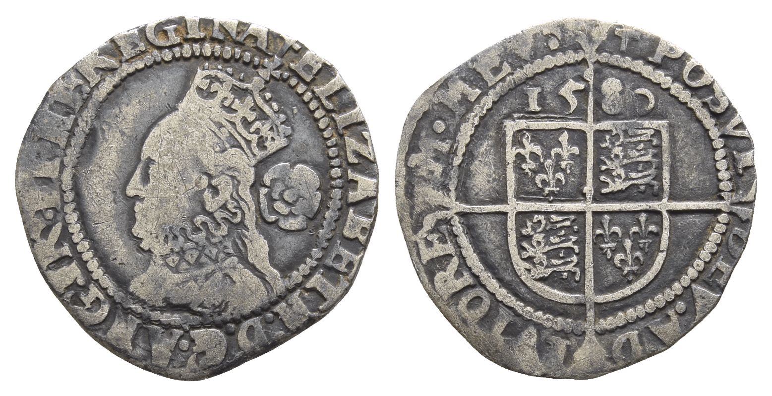 England. Tudor, Elizabeth I AR Threepence. Dated 1580. Tower (London) mint; i.m: Latin cross. Fifth issue.