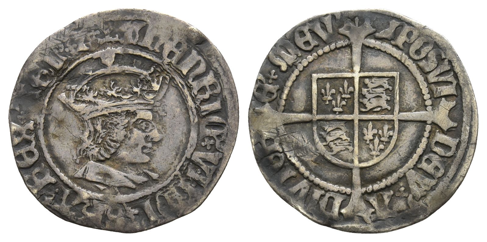 (Martlet) ҺЄNRIC '× V•I•I '× DI '× GRA '× RЄX × AGL × Z ×, crowned and draped bust to right / (Martlet) POSVI DЄV '× A-DIVTOR-Є '× ᙏЄV', coat-of-arms over long cross fourchée. North 1750; SCBC 2261. 1.52gr, 20mm, 6h.