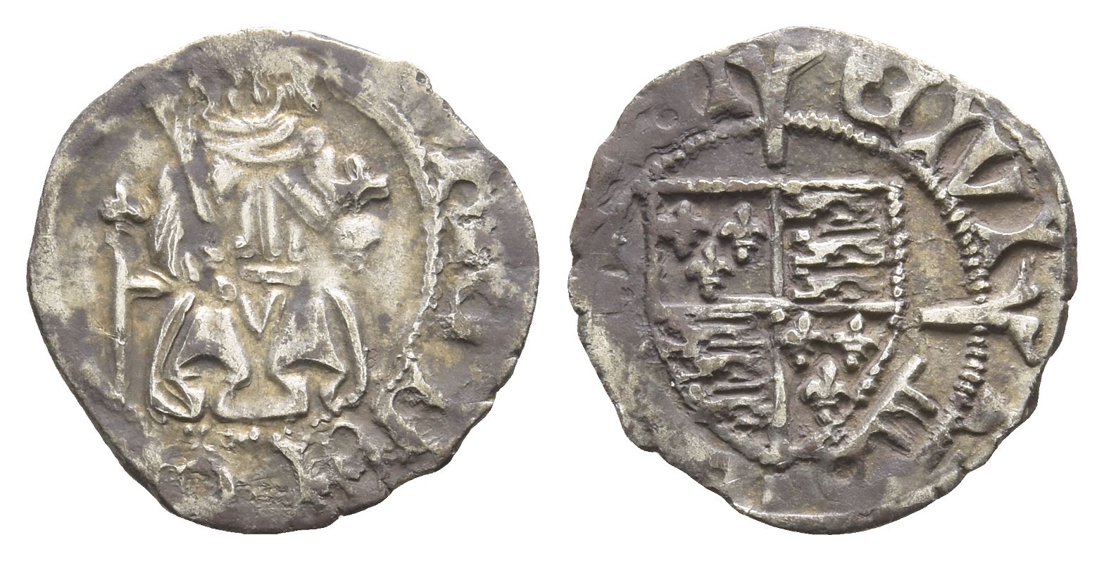 Henry enthroned facing, holding lis-tipped sceptre and globus cruciger, on throne with one pillar decorated with trefoil / Coat-of-arms over long cross fourchée; keys flanking. North 1728; SCBC 2236. 0.73gr, 14mm, 3h.