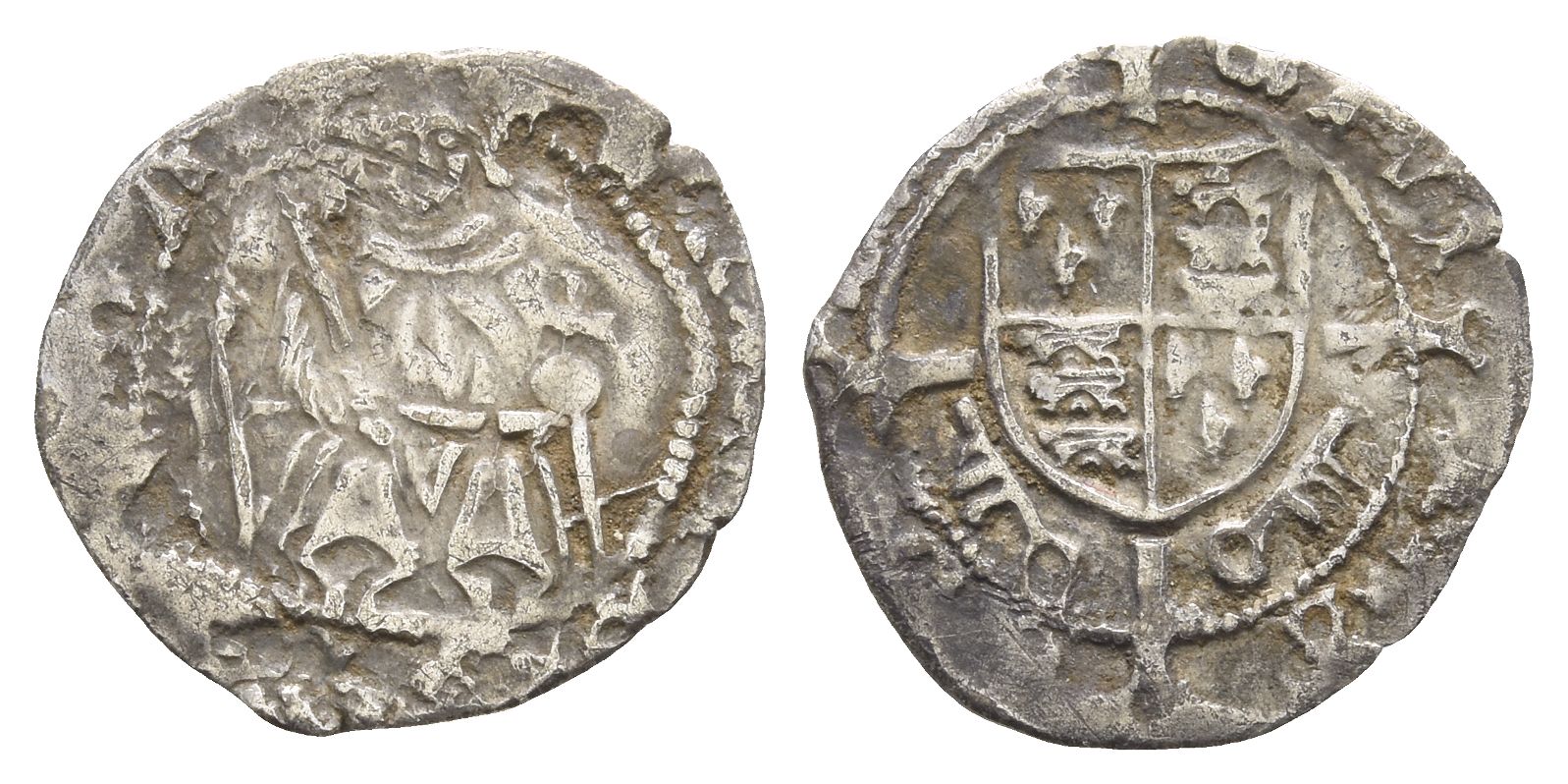 Henry enthroned facing, holding lis-tipped sceptre and globus cruciger, on throne with one pillar decorated with trefoil / Coat-of-arms over long cross fourchée; keys flanking. North 1728; SCBC 2236. 0.69gr, 16mm, 9h.
