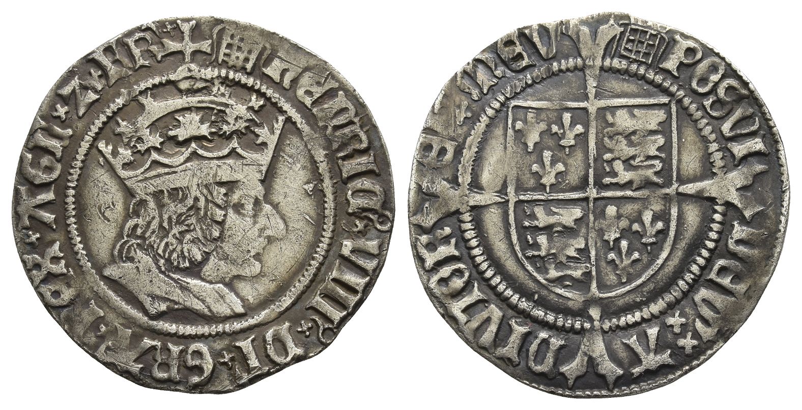 (Portcullis) ҺЄNRIC 9ˣ VIII 9ˣ DI 'ˣ GRA 'ˣ RЄX ˣ AGL ˣ Z ˣ FR 'ˣ, crowned bust to right with features of Henry VII (Laker A) / (Portcullis) POSVI DЄV' ˣˣ A-DIVTORЄ' ˣˣ MЄV, coat-of-arms over long cross fourchée. North 1762; SCBC 2316. 2.81gr, 25mm, 7h.