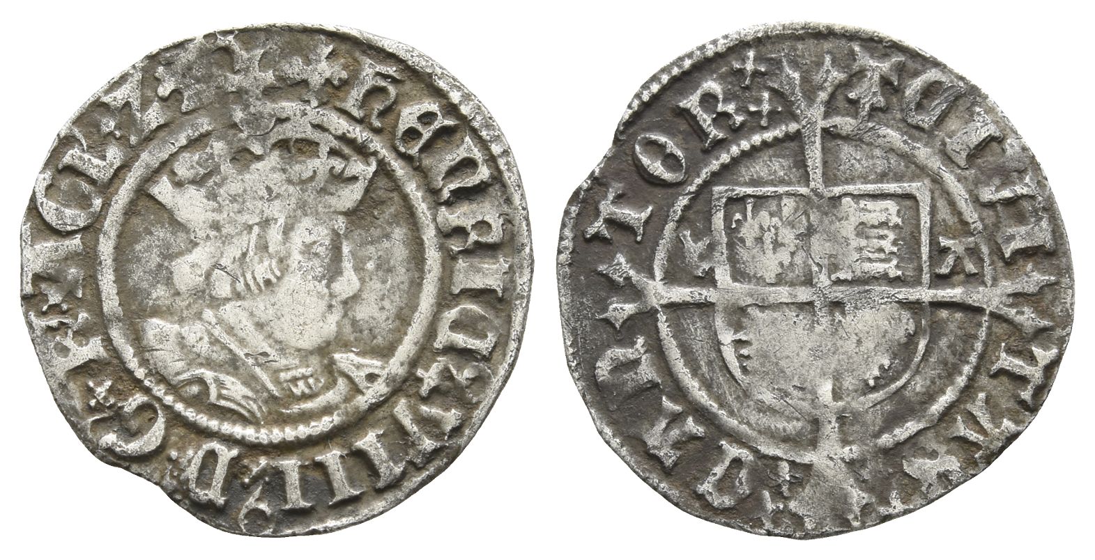England. Tudor, Henry VIII AR Halfgroat. Struck 1526-1532. Canterbury mint; i.m: cross patonce/T. William Warham, archbishop. Second coinage.