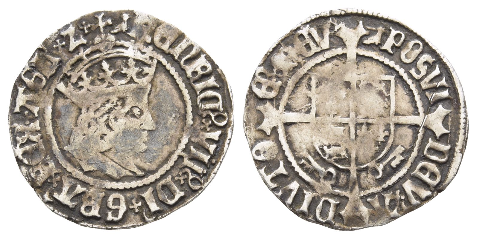 (Martlet) ҺЄNRIC 9x VII 9x DI' + GRA' x RЄX + AGL' x Z x, crowned and draped bust of Henry VIII to right / (Martlet) POSVI DЄV' x A-DIVTOR-Є' x ᙏЄV, coat of arms over cross fourchée, two keys below. North 1769; SCBC 2323. 1.64gr, 20mm, 5h.
