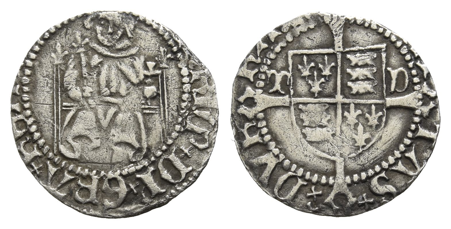 Durham mint; i.m: uncertain. Thomas Ruthall, bishop (1509-1523). First coinage. Sovereign type. [ҺЄN]RIC' ˣ DI' ˣ GRA ˣ RЄX [AGL Z], Henry enthroned facing, holding lis-tipped sceptre and globus cruciger; throne pillar on either side surmounted by lis / [CIVI]-TAS ˣˣ ˣˣ DVR-ҺAᙏ, quartered shield-of-arms on long cross fourchée; T D flanking. Cf. North 1777; cf. SCBC 2332. 0.63gr, 15mm,10h.