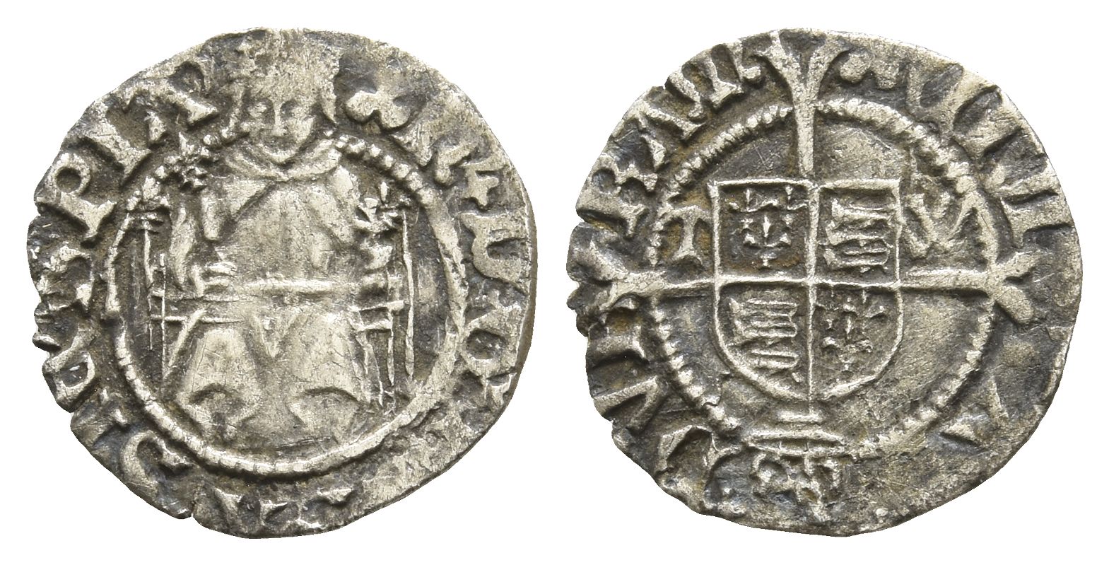 (Trefoil) Һ' ˣ D' ˣ G' ˣ ROSA ˣ SIЄ' ˣ SPIA', Henry enthroned facing, holding lis-tipped sceptre and globus cruciger, throne pillar on either side surmounted by lis / (Trefoil) CIVI-TAS ˣ DVR-RAᙏ, coat-of-arms over long cross fourchée; T W flanking, tasseled gallero below. North 1811; SCBC 2352. 0.61gr, 14mm, 7h.