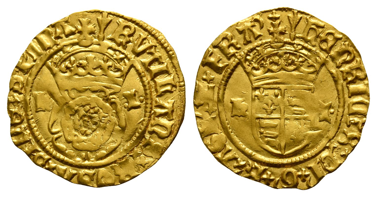 Tower mint; i.m: arrow. Second Coinage. Struck 1526-1544. (Arrow) RVTILANS ˣˣ ROSA ˣˣ SINЄ ˣˣ SPINA, crowned rose dividing Һ •I• (for Henry and Jane) / (Arrow) ҺЄNRIC '+ 8 + DI '+ G '+ R '+ AGL '+ Z + FRA' +, crowned shield dividing Һ •I• (for Henry and Jane). North 1795; SCBC 2287. 1.82gr, 20mm, 10h.