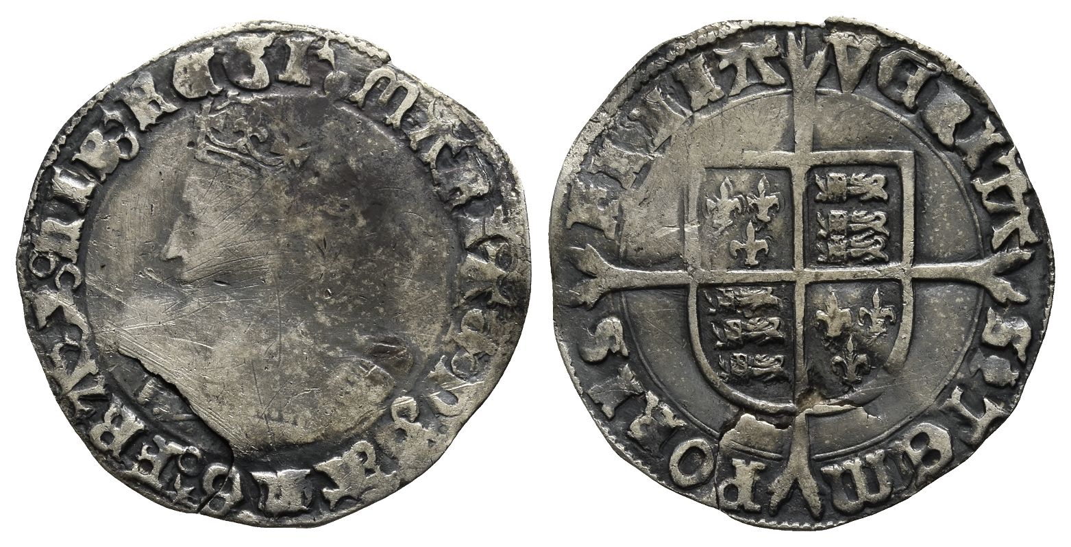 Tower (London) mint; i.m: pomegranate. Struck 1553-1554. ᙏARIA ◦(pomegranate)◦ D ◦' G ◦' ANG ◦' FRA ◦' Z(retrograde) ⦂ ҺIB ⦂ RЄGI', crowned bust to left / VЄRITA-S (pomegranate) TЄᙏ-PORIS FILIA, coat-of-arms over long cross fourchée. North 1960; SCBC 2492. 1.95gr, 24mm, 10h.