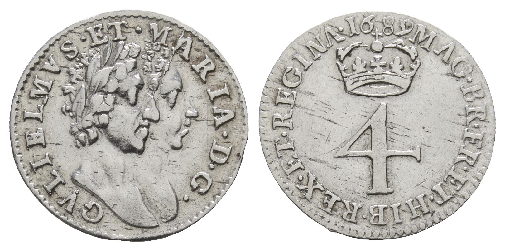 GVLIELMVS · ET · MARIA · D · G, conjoined laureate busts of King William and Queen Mary to right / MAG · BR · FR · ET · HIB · REX · ET · REGINA · 1689 ·, central crowned denomination. SCBC 3439; KM 471. 1.99gr, 19mm, 5h