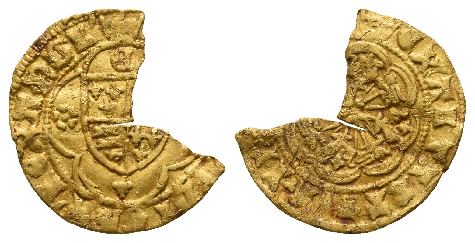 Tower (London) mint; i.m: crown/crown. Class VII; struck 1468. (Crown) [ЄDWAR]D' DI GRA' RЄX AnGL', coat-of-arms; Є above, rose to left, [sun to right]; all within quatrefoil / ЄXΛLTΛBITVR (trefoil) In [GLORIA], long cross fourchée, with rose at center and lis; all over radiate sun; lions passant to left in quarters. North 1560; SCBC 1965. 1.45gr, 20mm, 12h.