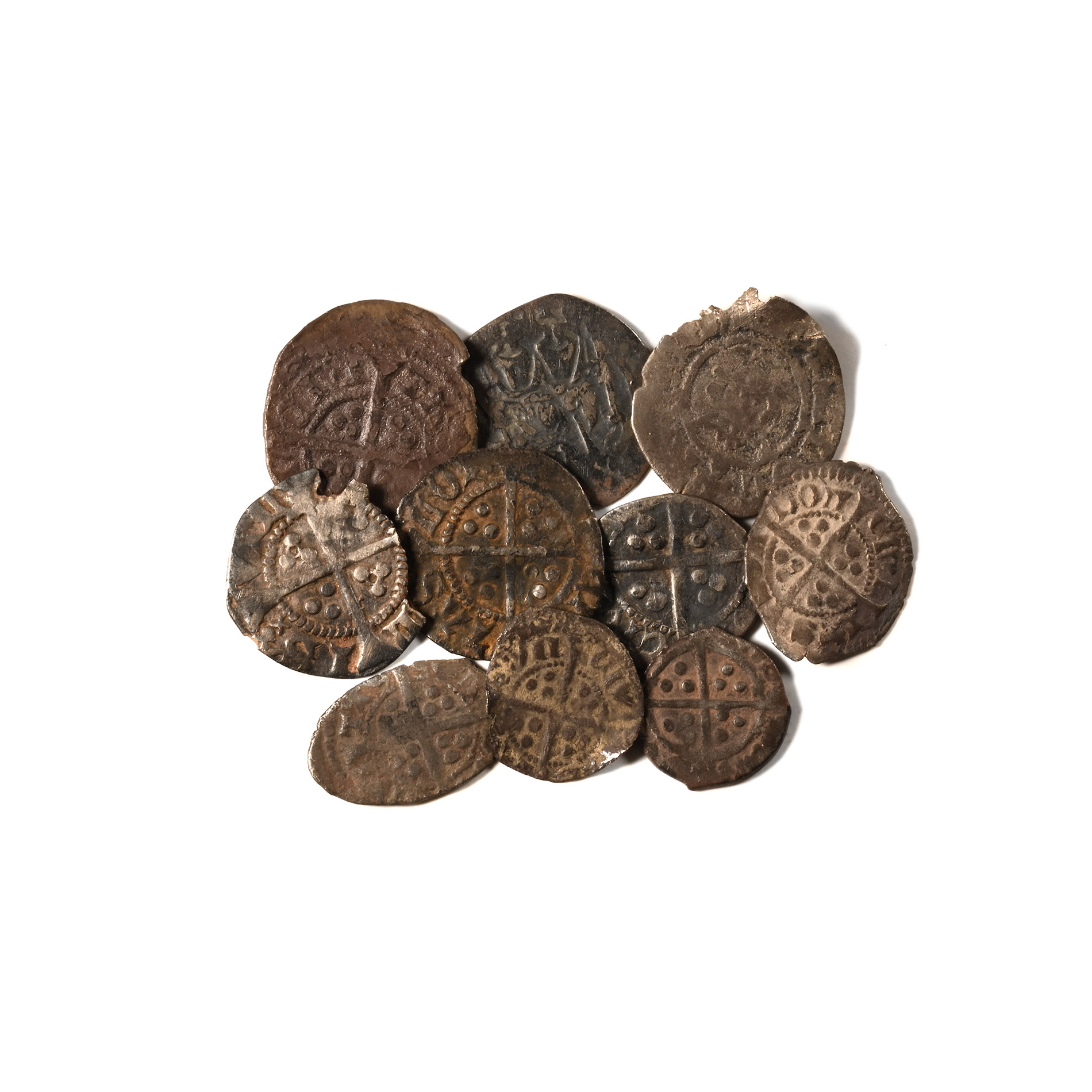 Group comprising: halfpennies and farthings, London (8); Calais (1), Henry VII or VIII sovereign penny, York. 4.69 grams total.