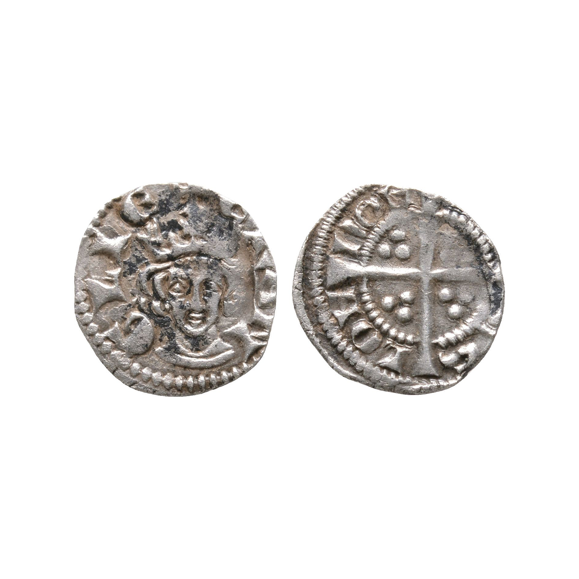 New coinage, class 3. Obv: facing bust with +E R ANGLIE legend. Rev: long cross and pellets dividing LON DON IEN SIS legend for London mint. 0.35 grams.