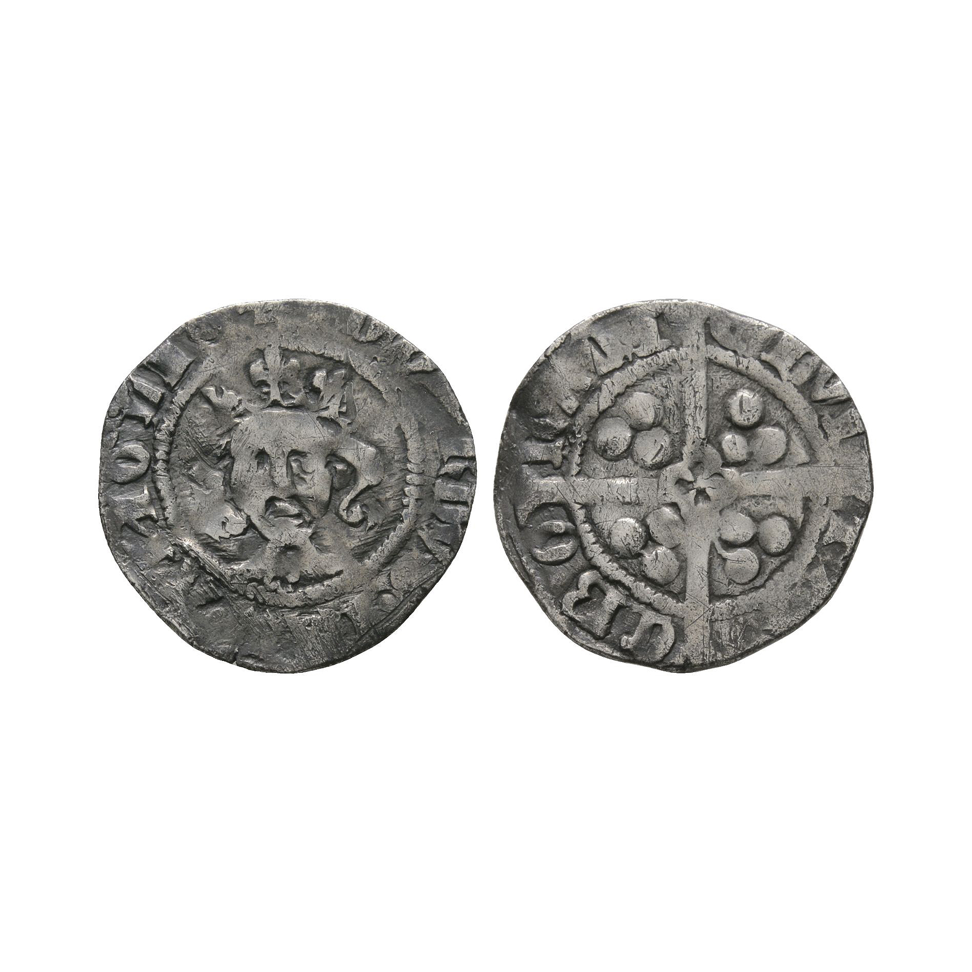 Treaty period. Obv: facing bust with quatrefoil on breast and +[voided quatrefoil] EDWARDVS REX ANGLI legend. Rev: long cross and pellets with quatrefoil at centre dividing CIVI TAS EBO RACI legend for York mint under Archbishop Thoresby. 1.01 grams, 17 mm.