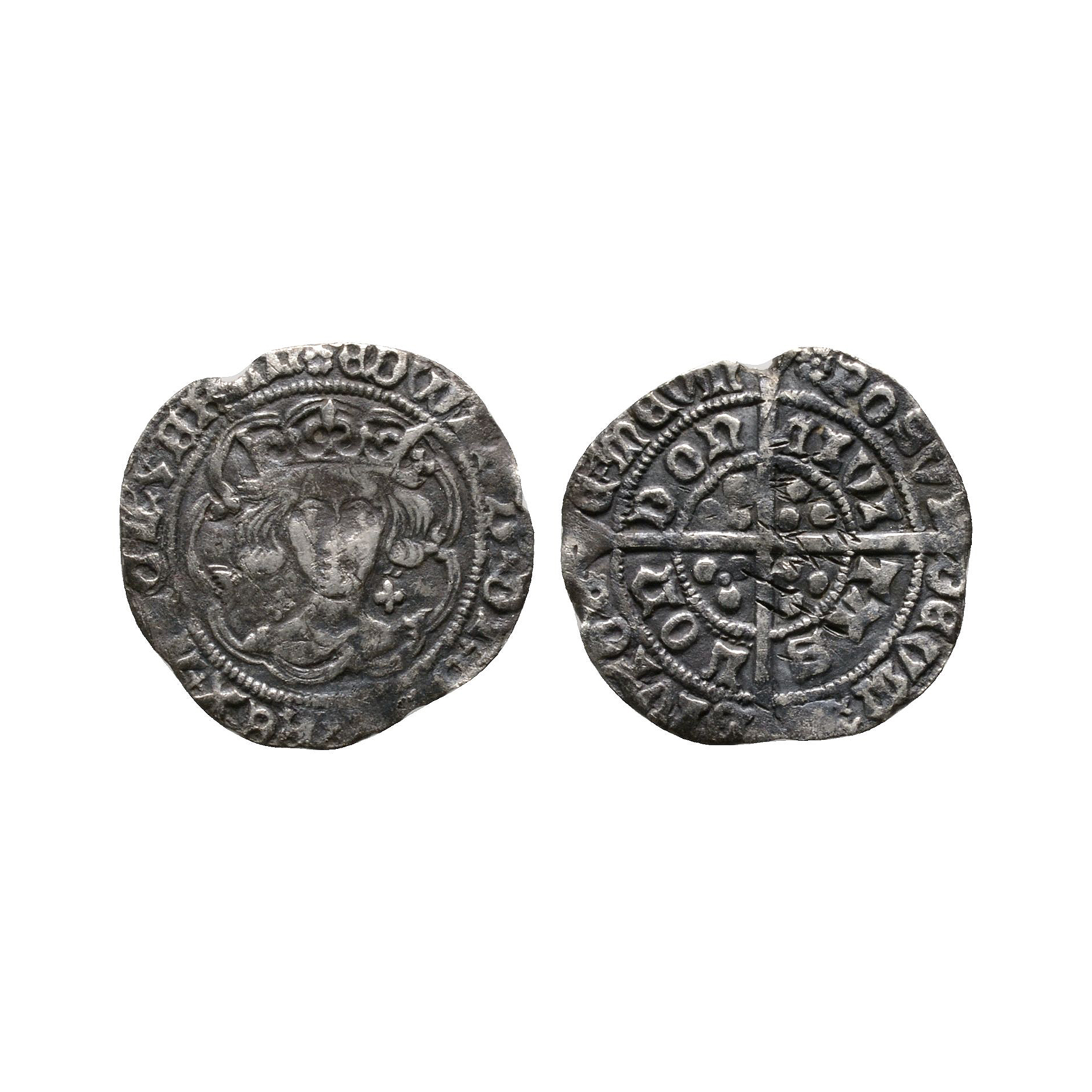 First reign, light coinage, class Vc. Obv: facing bust with quatrefoils at neck within tressure with EDWARD DI GRA REX ANGL Z FRAN legend and 'rose' mintmark. Rev: long cross and pellets with extra pellet in first quarter with POSVI DEVM ADIVTORE MEVM and CIVITAS LONDON legends for London mint. 2.48 grams.