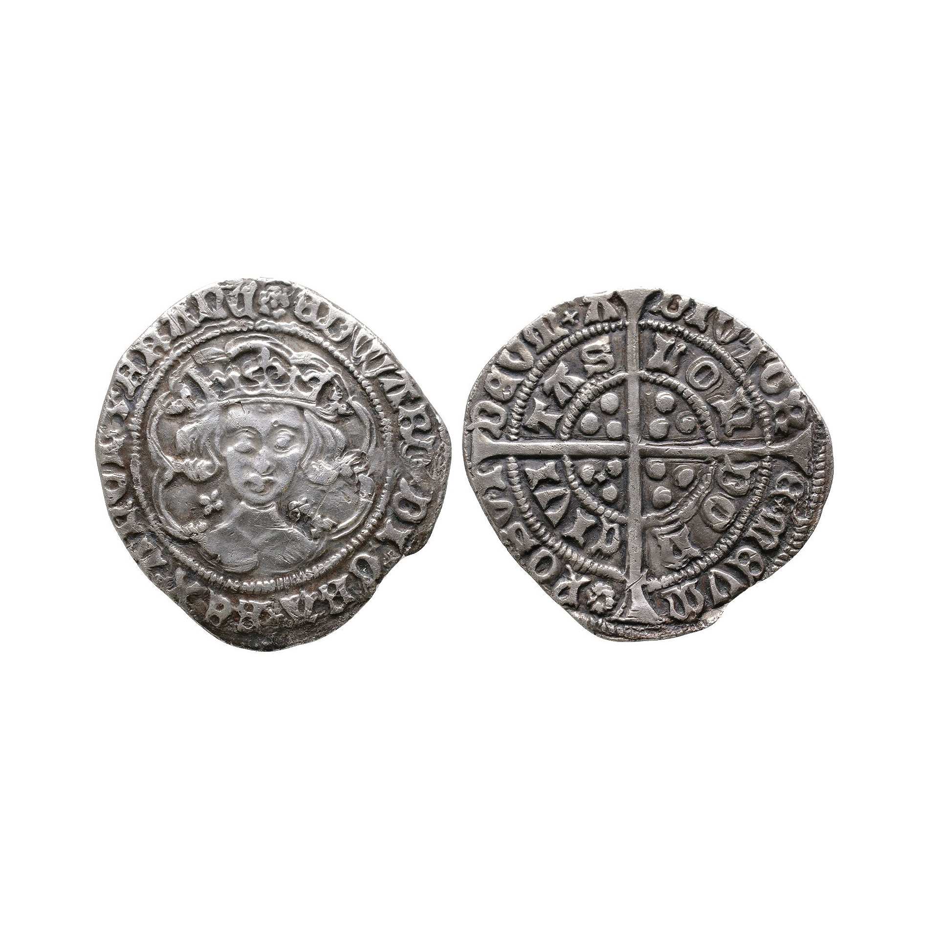 First reign, light coinage. Obv: facing bust with quatrefoils at neck within tressure with EDWARD DI GRA REX ANGLZ FRA legend with 'rose' mintmark. Rev: long cross and pellets with extra pellet in first quarter and POSVI DEVM ADIVTORE MEVM and CIVITAS LONDON legends for London mint. 3.06 grams.