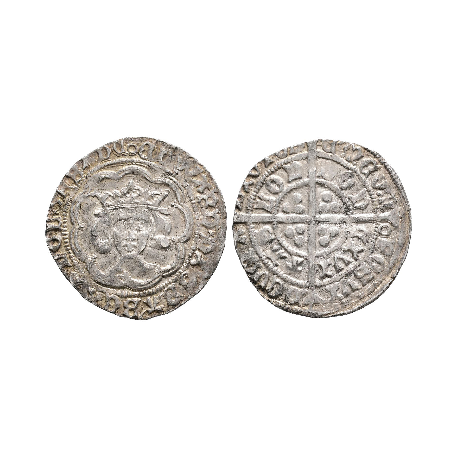 Second reign. Obv: facing bust within tressure with EDWARD DI GRA REX ANGL Z FRANC legend with 'annulet' mintmark. Rev: long cross and pellets with POSVI DEVM ADIVTORE MEV and CIVITAS LONDON legends for London mint. 2.84 grams.