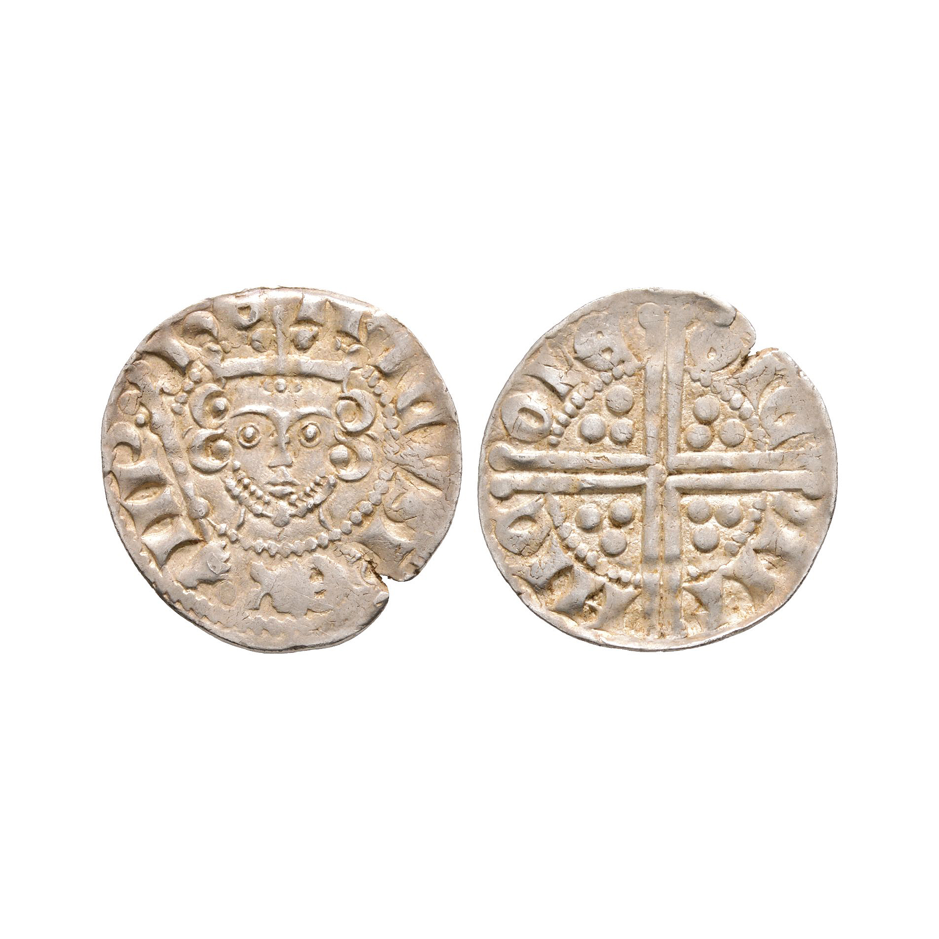 Class 5b2. Obv: facing bust with sceptre and HENRICVS REX III legend. Rev: long voided cross and pellets dividing NIC OLE ONC ANT legend for the moneyer Nicole at Canterbury mint. 1.41 grams.