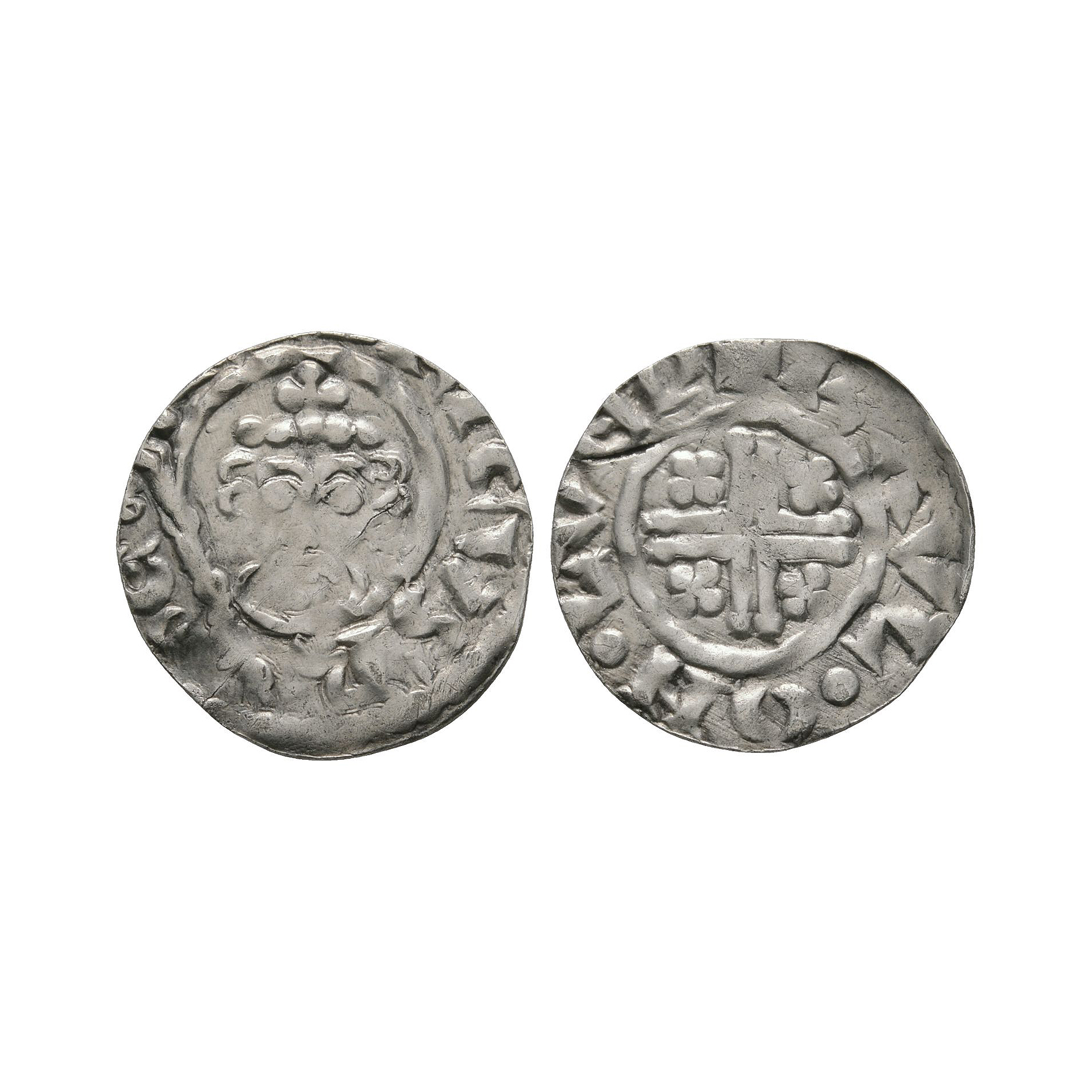 Class 1c. Obv: facing bust with sceptre and HENRICVS REX legend. Rev: short voided cross and quatrefoils with +RAVL.ON.LVND legend for the moneyer Raul at London mint. 0.99 grams, 18 mm.