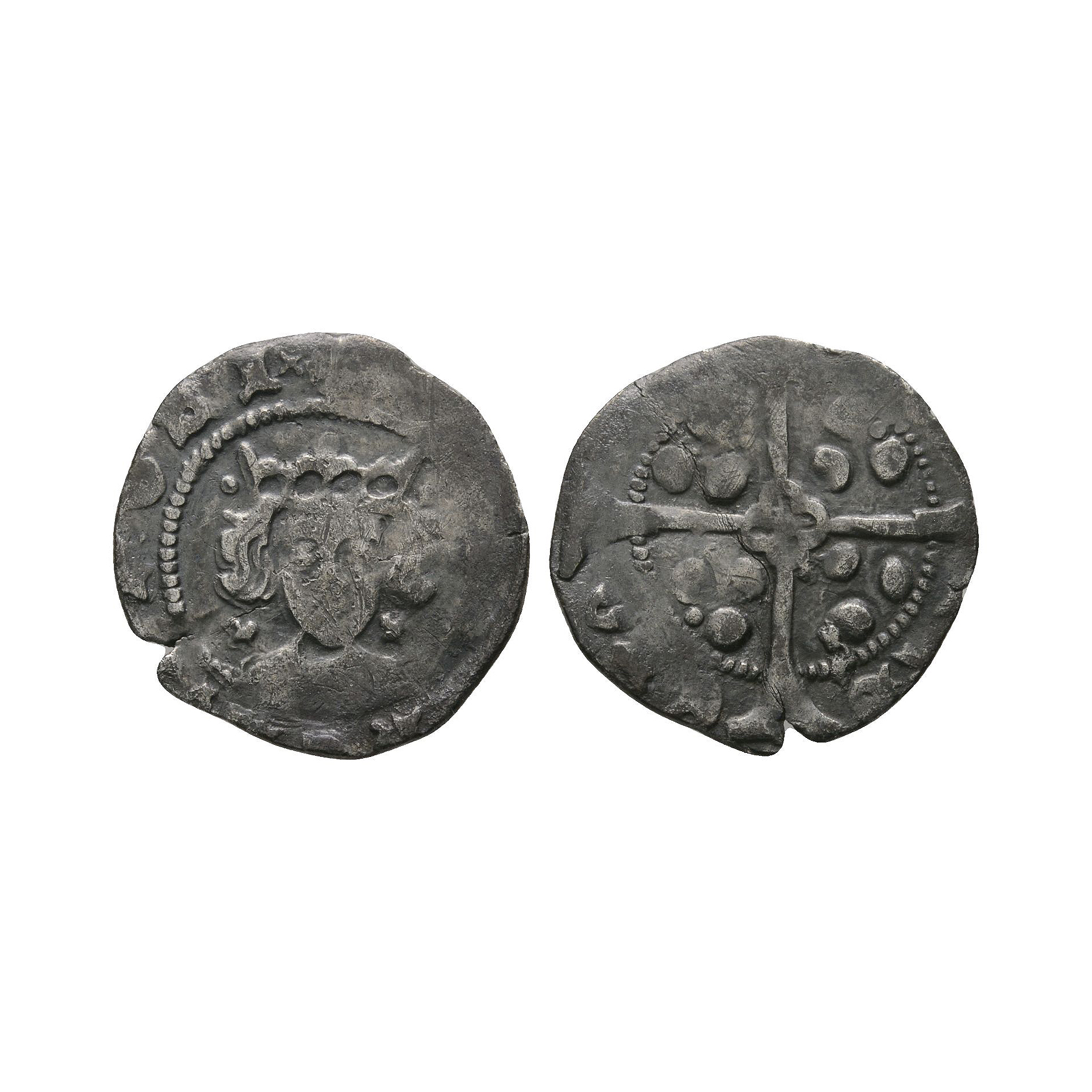 Local dies. Obv: facing bust with leaf on breast, saltires by neck, pellets by crown and HENRIC DI GRA REX ANGLI legend. Rev: long cross and pellets with cross at centre and extra pellet in each quarter with CIVI TAS OBO RACI legend for York mint. 0.79 grams, 16 mm.