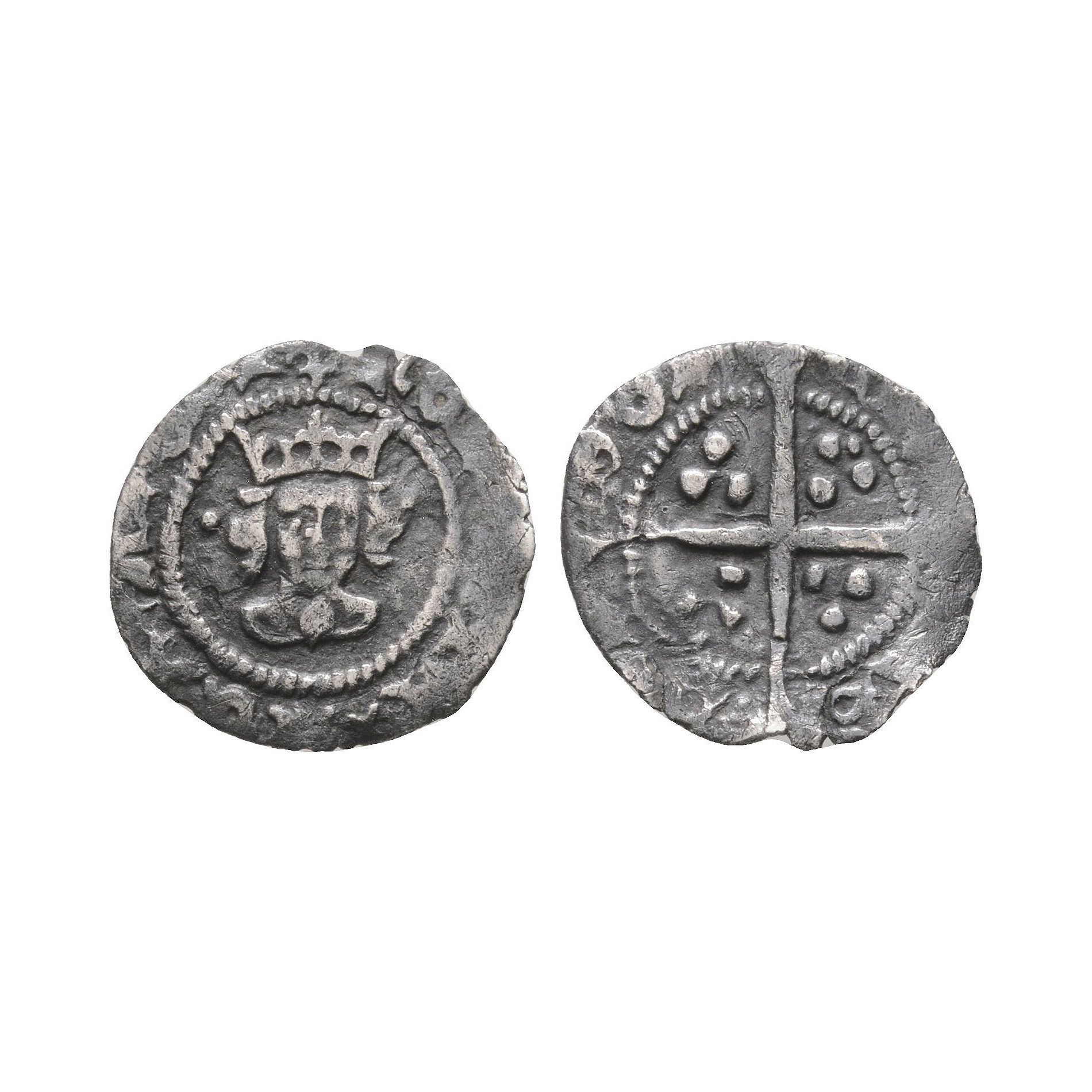 Obv: facing bust with leaf on breast, pellet to each side of hair and + HENRIC REX ANGL legend with plain cross. Rev: long cross dividing CIVITAS LONDON legend for London mint with two extra pellets in two quarters. 0.37 grams, 12 mm.