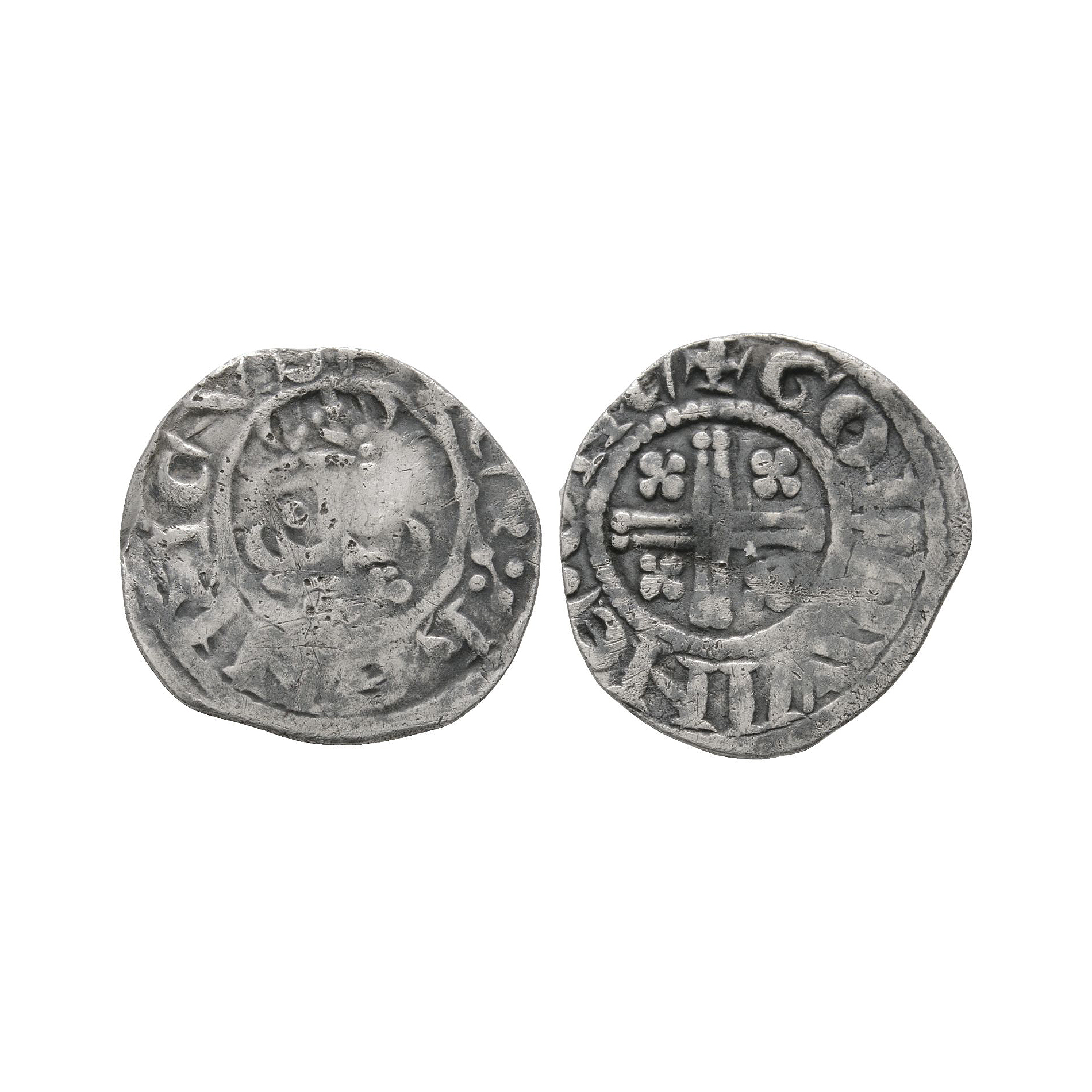 Obv: facing bust with sceptre and HENRICVS REX legend. Rev: short voided cross and quatrefoils with + GOLDWINE.ON.C, for Goldwine at Canterbury. 1.33 grams, 18 mm.