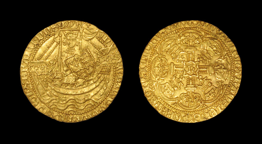 1413-1422 AD, class E, London mint. Obv: king standing in ship, ropes 2/1, holding sword and shield with annulet on side of ship, mullet and annulet to left of sword hilt, pellet at sword tip and trefoil to right of shield with +HENRIC DI GRA REX ANGL Z FRANC DNS HYB legend. Rev: floriate cross with crown over lion over trefoil in quarters, a pellet to 4th quarter with +IHC AVTEM TRANSIENS PER MEDIV ILLORV IBAT legend. 6.85 grams.