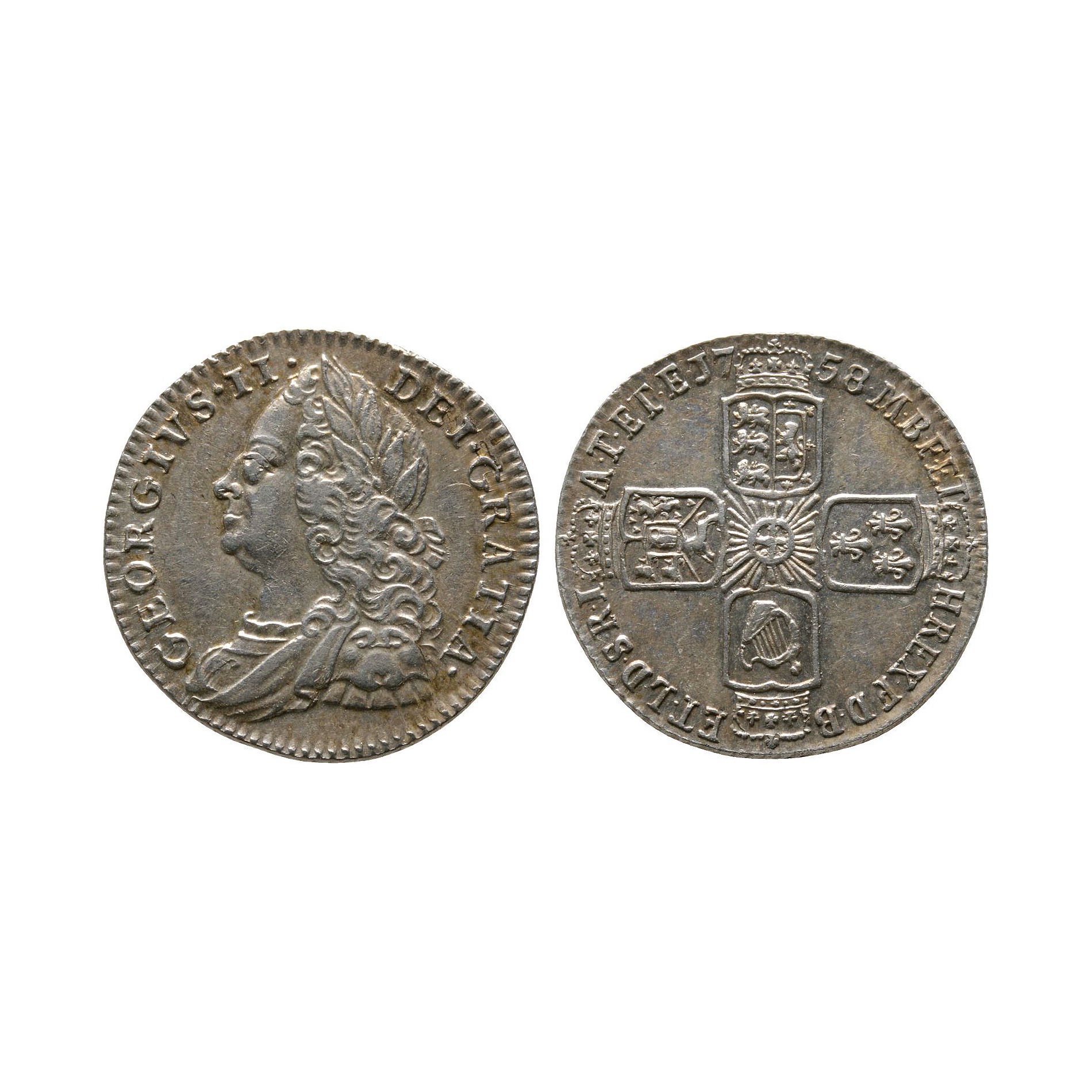 English Milled Coins - George II - 1758 - AR Sixpence Dated 1758 A.D.