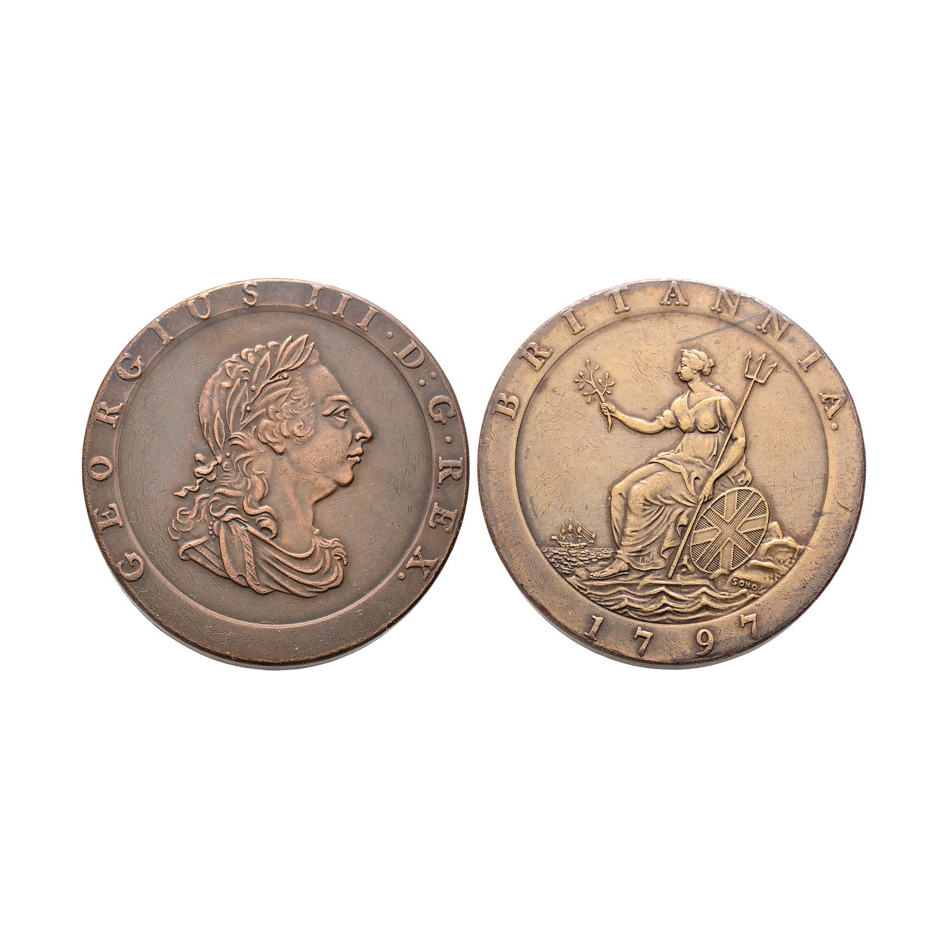 A pattern restrike 'dated 1797'. Obv: profile bust with GEORGIUS III D G REX incuse legend. Rev: Britannia with BRITANNIA incuse legend and date. 55.32 grams, 41 mm.