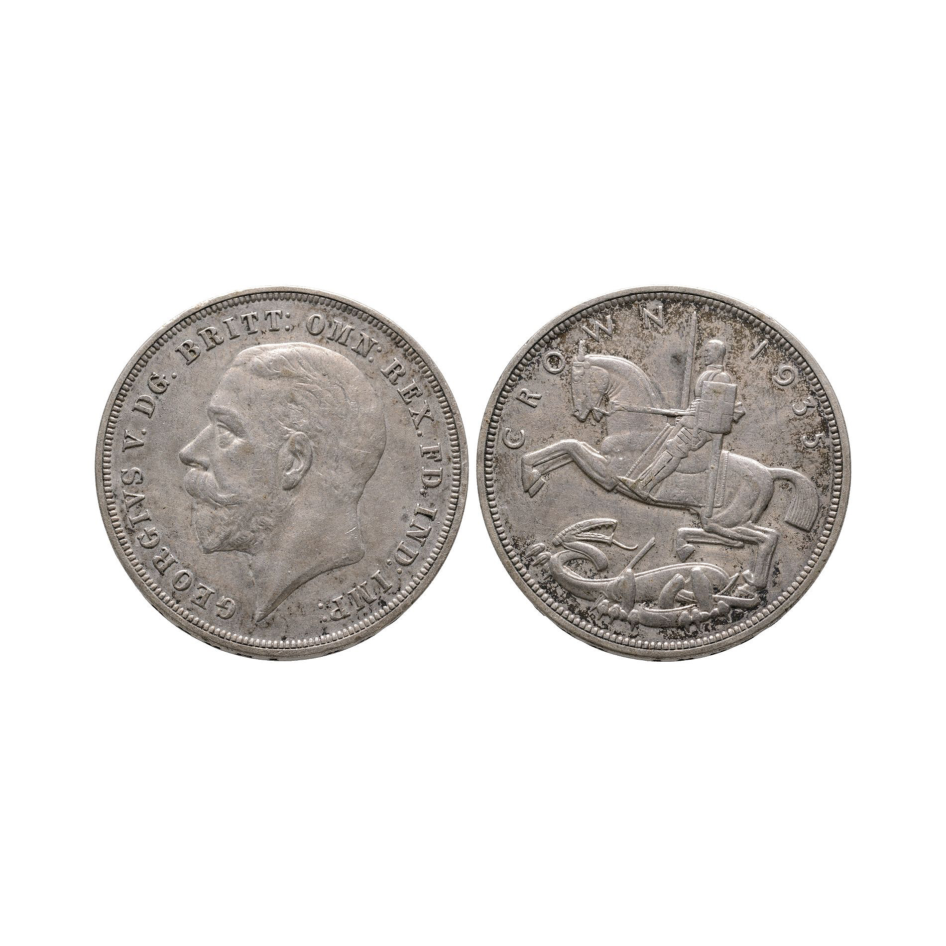 Silver Jubilee issue. Obv: profile bust with GEORGIVS V DG BRITT OMN REX FD IND IMP legend. Rev: St George and dragon with date and CROWN legend, edges incuse: DECVS ET TUTAMEN ANNO REGNI XXV legend. 28.23 grams.