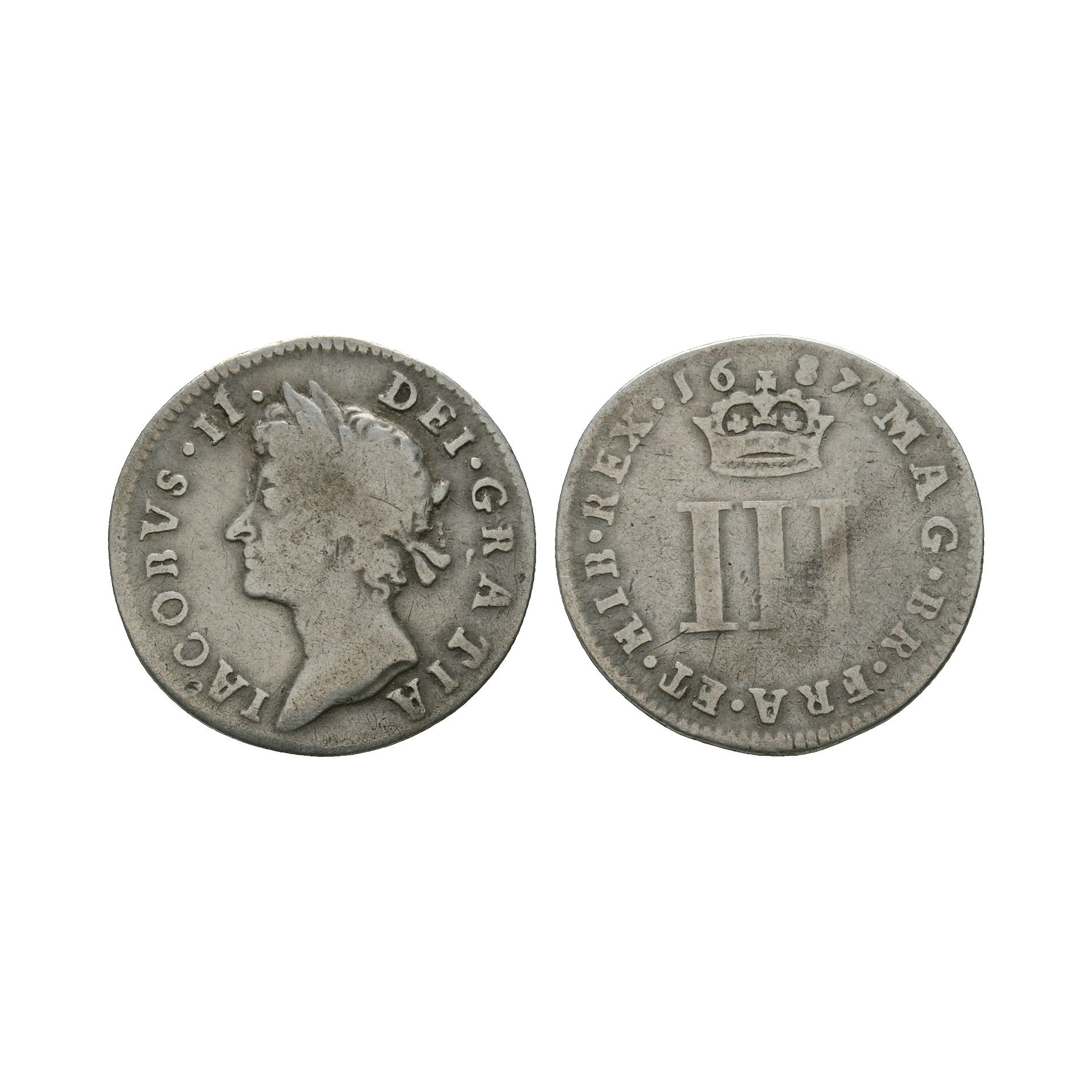 English Milled Coins - James II - AR Threepence Dated 1687 A.D.