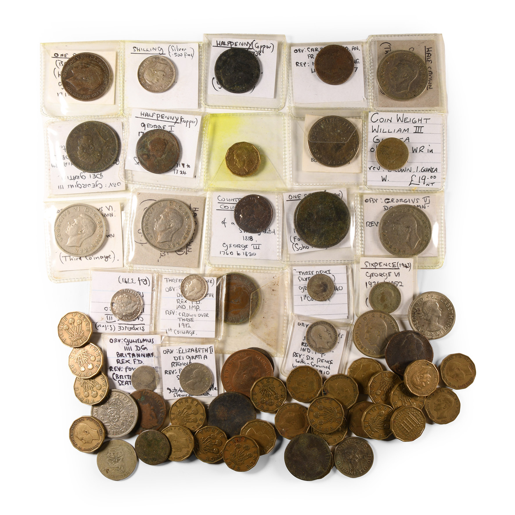 Comprising: various monarchs, denominations, issues and types, many with handwritten coin identification tickets. 470 grams total, 16-32 mm.