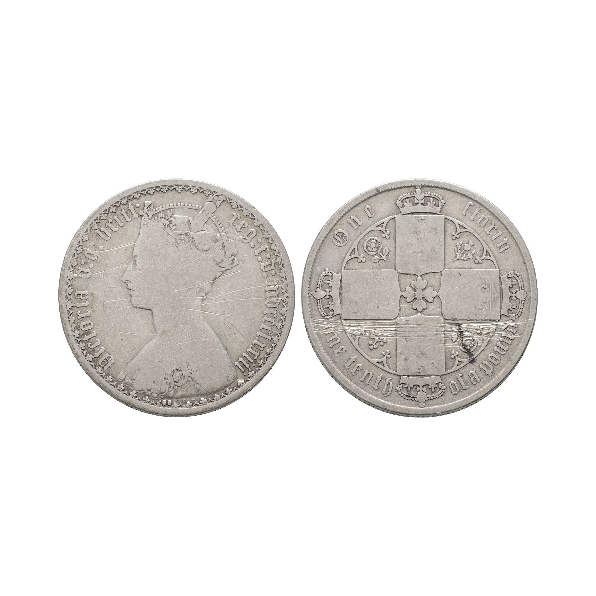 Type B3. Obv: profile bust and Gothic VICTORIA D G BRITT REG F D legend and date. Rev: cruciform shields with emblems in angles and Gothic ONE FLORIN ONE TENTH OF A POUND legend. 10.78 grams, 29 mm.