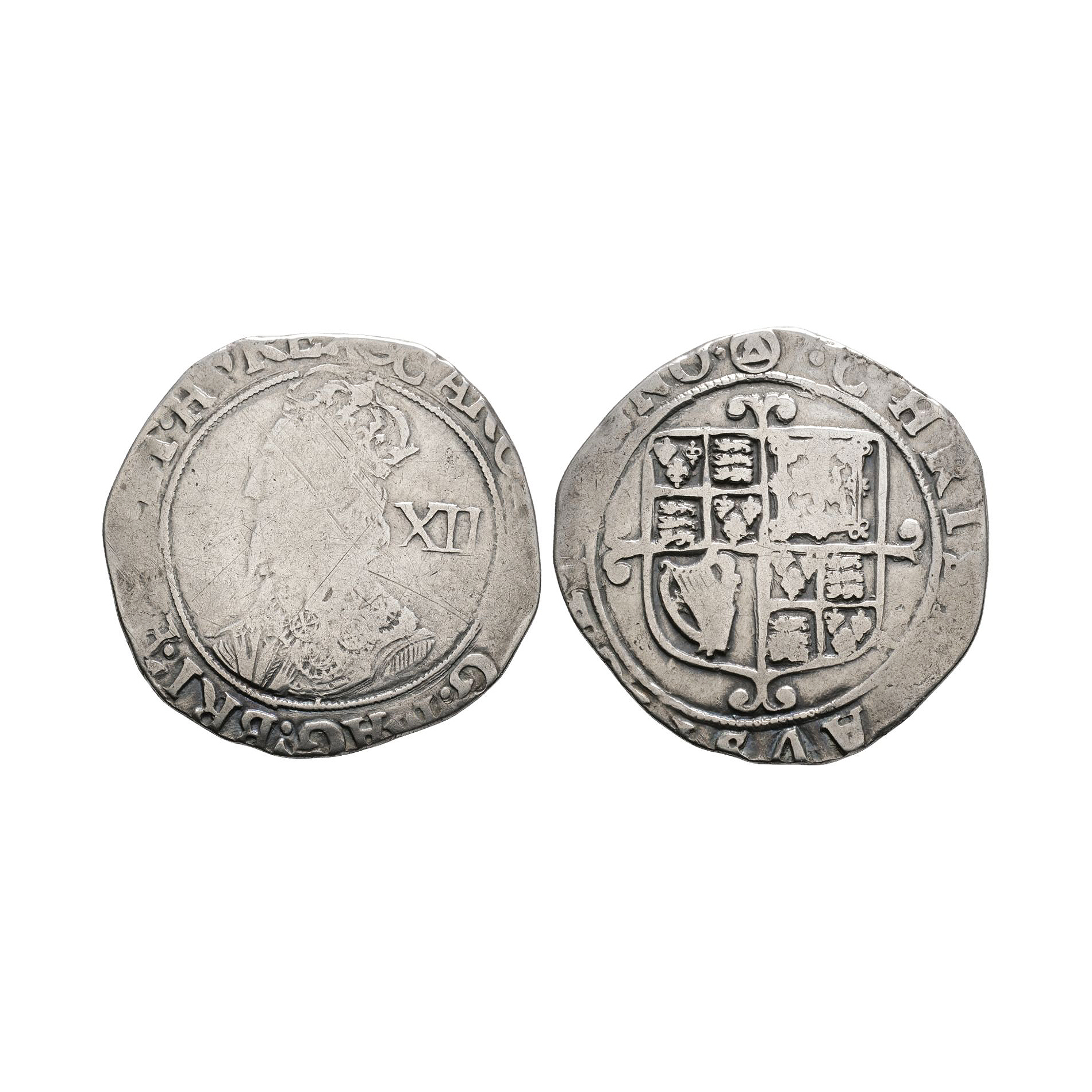 Obv: profile bust with XII behind and CAROLVS D G MAG BRI FRA ET HIB REX legend and 'triangle-in-circle' mintmark. Rev: arms with CHRISTO AVSPICE REGNO legend. 5.66 grams.