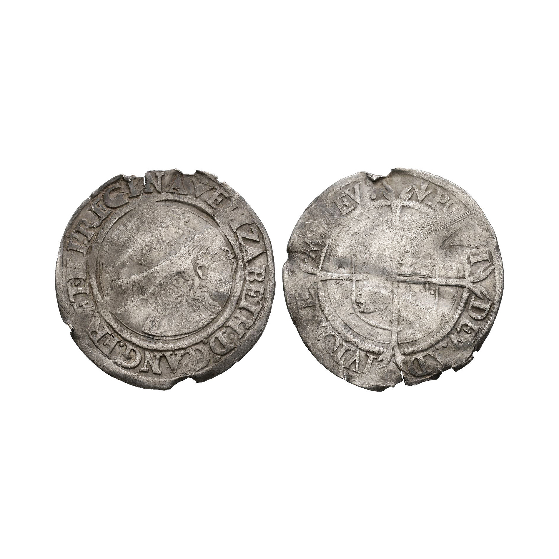 Third and fourth issues. Obv: profile bust with rose behind and ELIZABETH D G ANG FR ET HI REGINA legend with 'pheon' mintmark. Rev: long cross over arms with uncertain date above and POSVI DEV ADIVTOREM MEV legend. 2.42 grams.