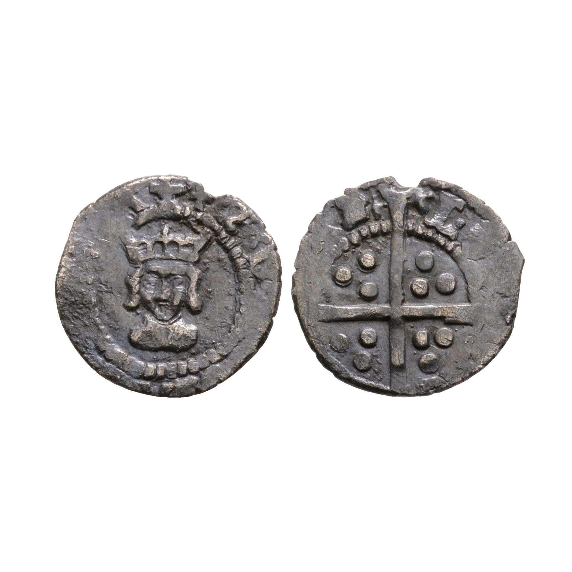 Obv: facing bust with unclear legend. Rev: long cross and pellets dividing CIVI TAS LON DON legend for London mint. 0.31 grams.