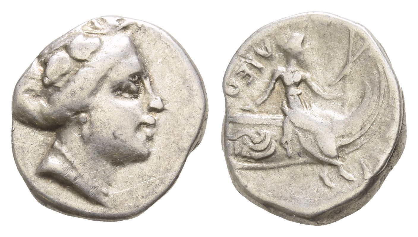 Wreathed head of the nymph Histiaia to right / The nymph Histiaia seated to right on stern of galley, holding stylis; wing on galley, IΣTIAIEΩN around. BCD Euboia 430-431; HGC 4, 1525. 2.11gr, 13mm, 12h.