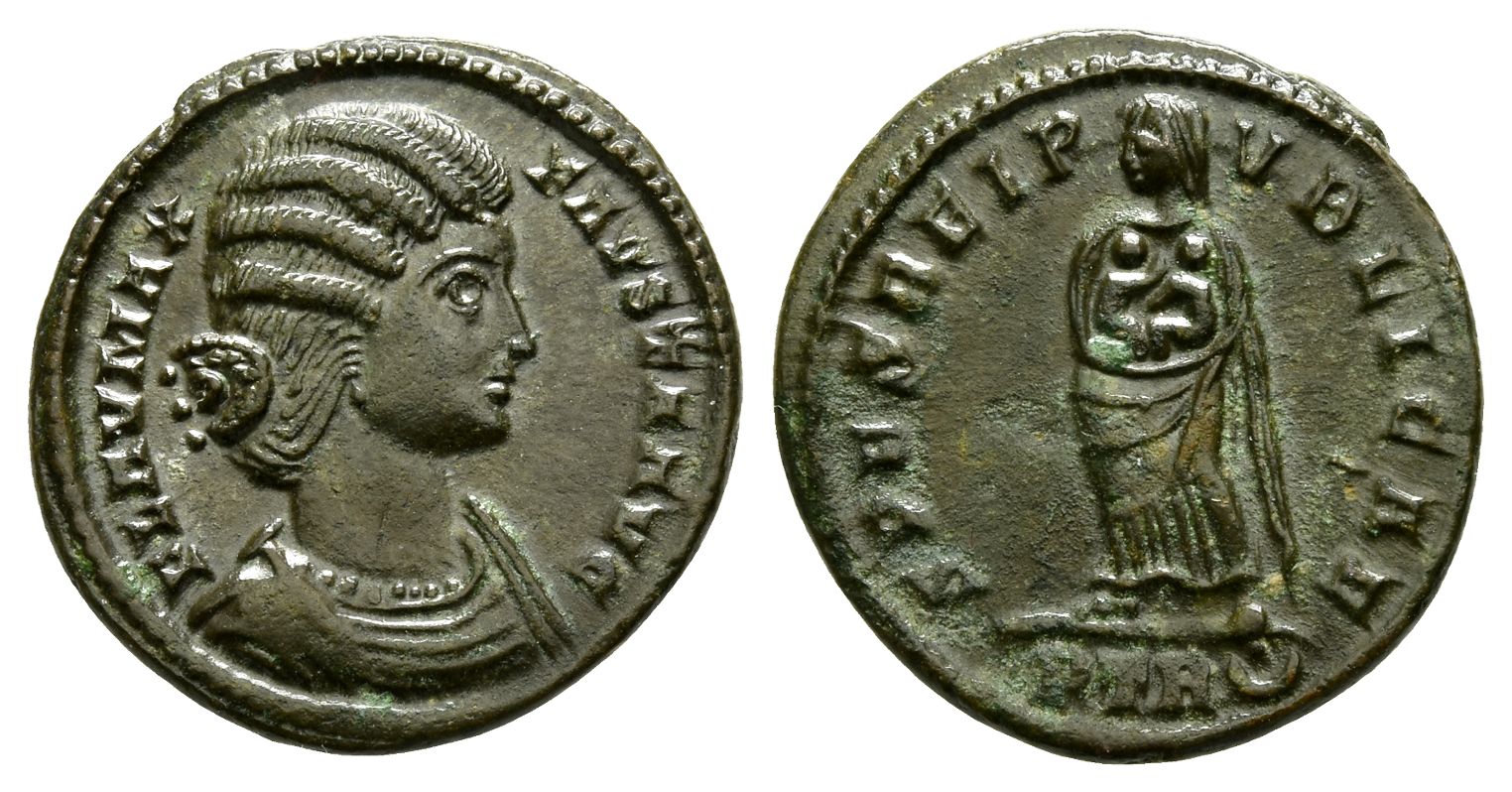Treveri mint; struck AD 325-326. 1st officina. FLAV MAX FAVSTA AVG, mantled bust to right / SPES REIPVBLICAE, Spes standing facing, head to left, holding two infants in her arms; PTR(pellet in crescent) in exergue. RIC VII 484. 3.05gr, 19mm, 12h