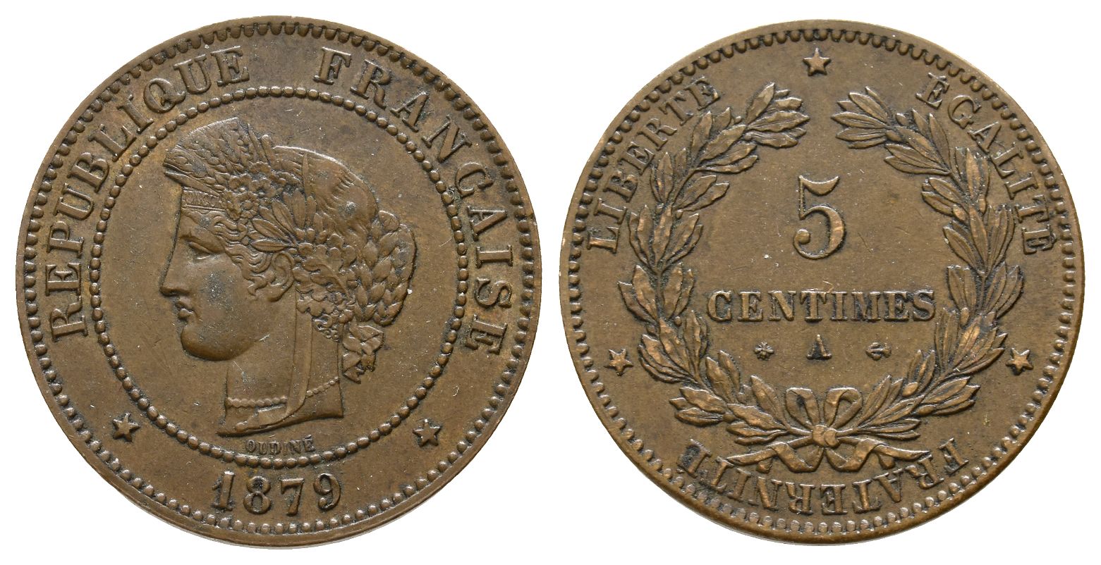 Paris mint. Design by Eugène-André Oudiné and Joseph-François Domard. REPUBLIQUE FRANÇAISE 1898, wreathed head of Concordia to left, below, OUDINÉ; all within dotted circle; date between stars below / LIBERTÉ * ÉGALITÉ * FRATERNITÉ *, 5 CENTIMES within wreath. F# 118; Gad# 157; KM# 821. 5.05gr, 25mm, 6h