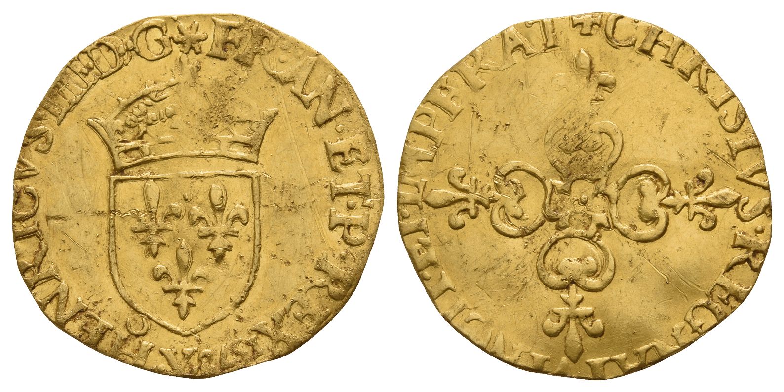 HENRICVS • III • D ✱ G FRஃAN • ET • P • REX 1578 •Y•, shield of France / + CHRISTVS • REGNAT • VINCIT • ET • IMPERAT, lilied cross. Duplessy 1121A; Ciani 1408; Laf. 960. 2.84gr, 24mm, 12h.