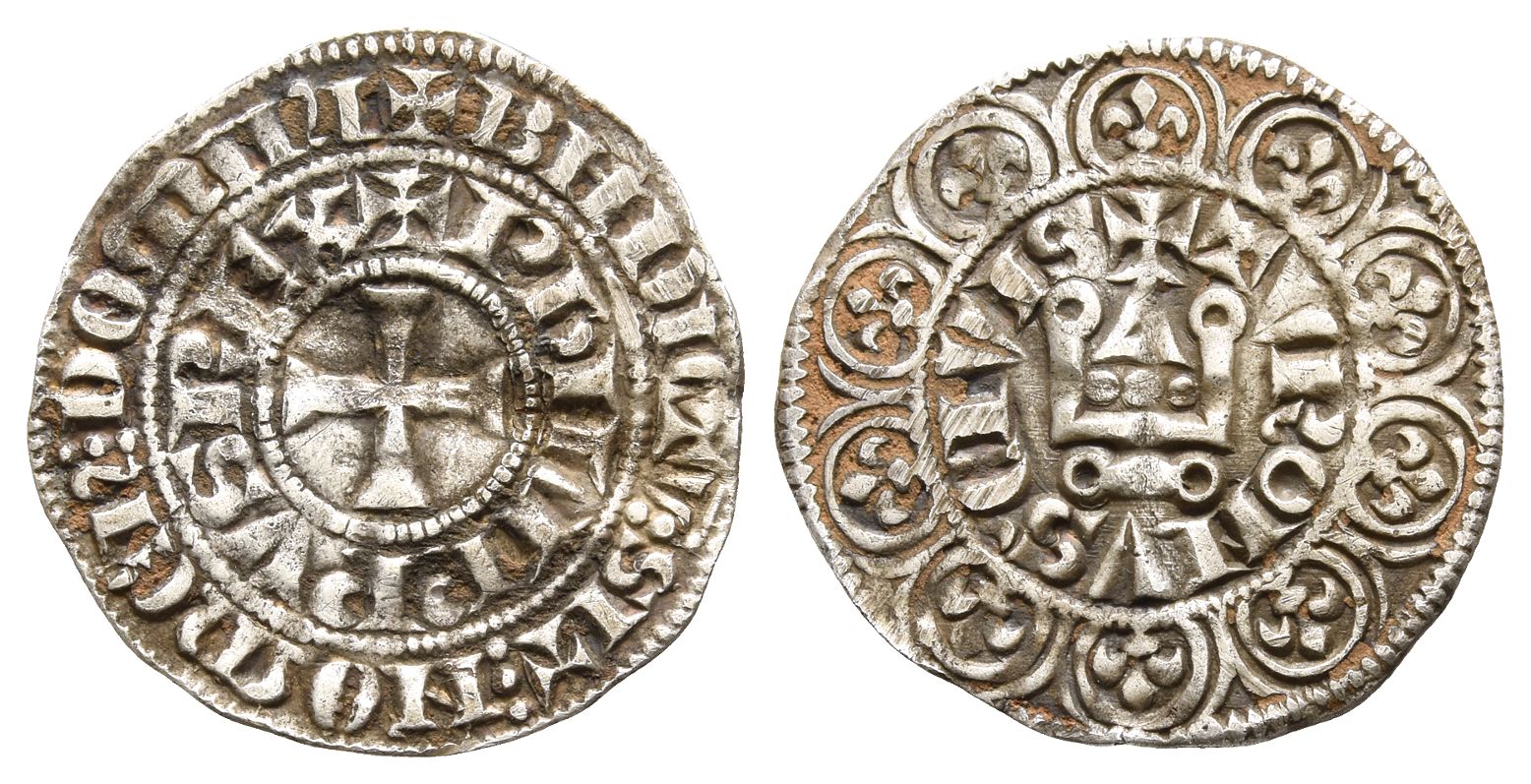 ✠ BHDICTV ⁝ SIT ⁝ NOᙏЄꞂ ⁝ DOᙏINI and ✠ PҺILIPPVS REX in two concentric circles around cross pattée / ✠ TVRONVS CIVIS, châtel tournois; all within border of ten lis. Duplessy 219d. 1.35gr, 20mm, 3h.