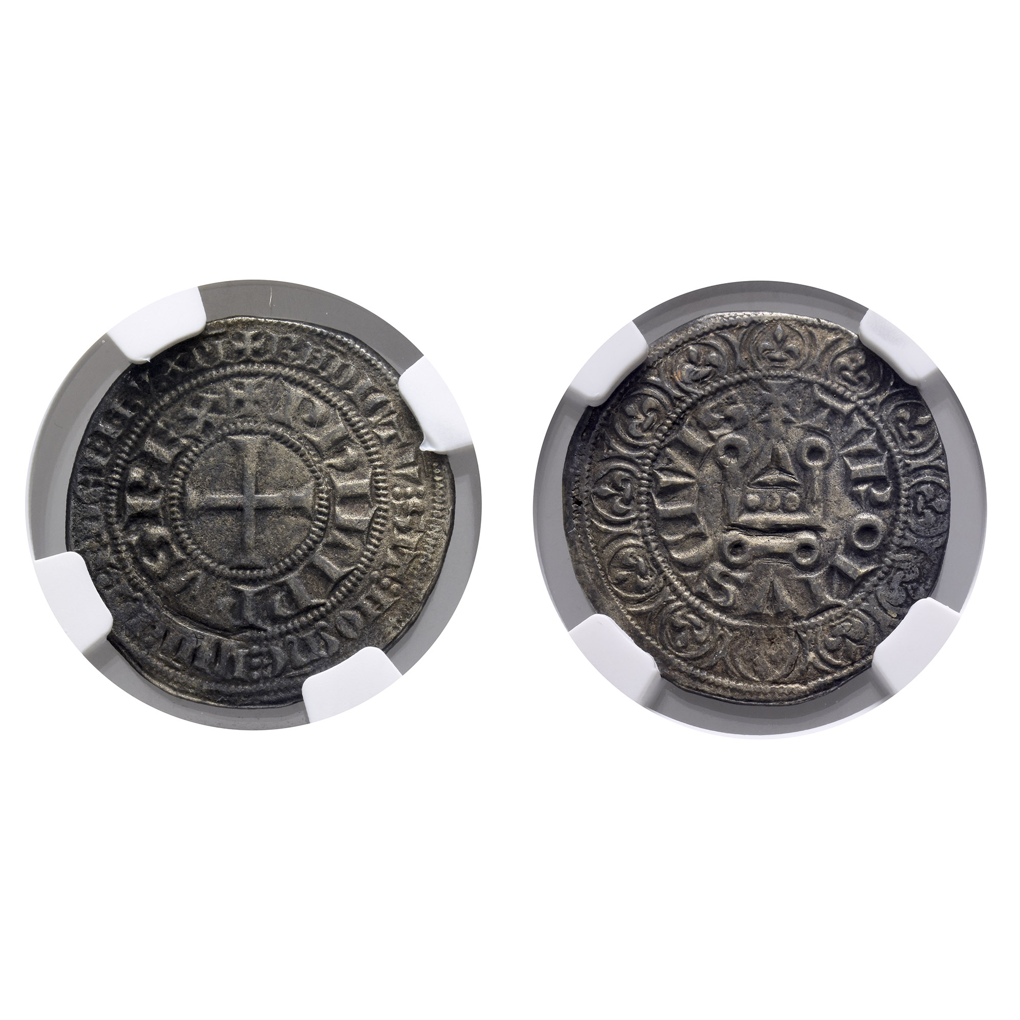 ✠ BHDICTV ⁝ SIT ⁝ HOᙏЄ ⁝ DHI ⁝ ꞂRI ⁝ DЄI ⁝ IҺV. XPI in outer margin, ✠ PҺILIPPVS REX in inner margin, short cross pattée / ✠ TVROHVS CIVIS around châtel tournois within border of twelve lis. NGC graded GENUINE (#8230595-021).