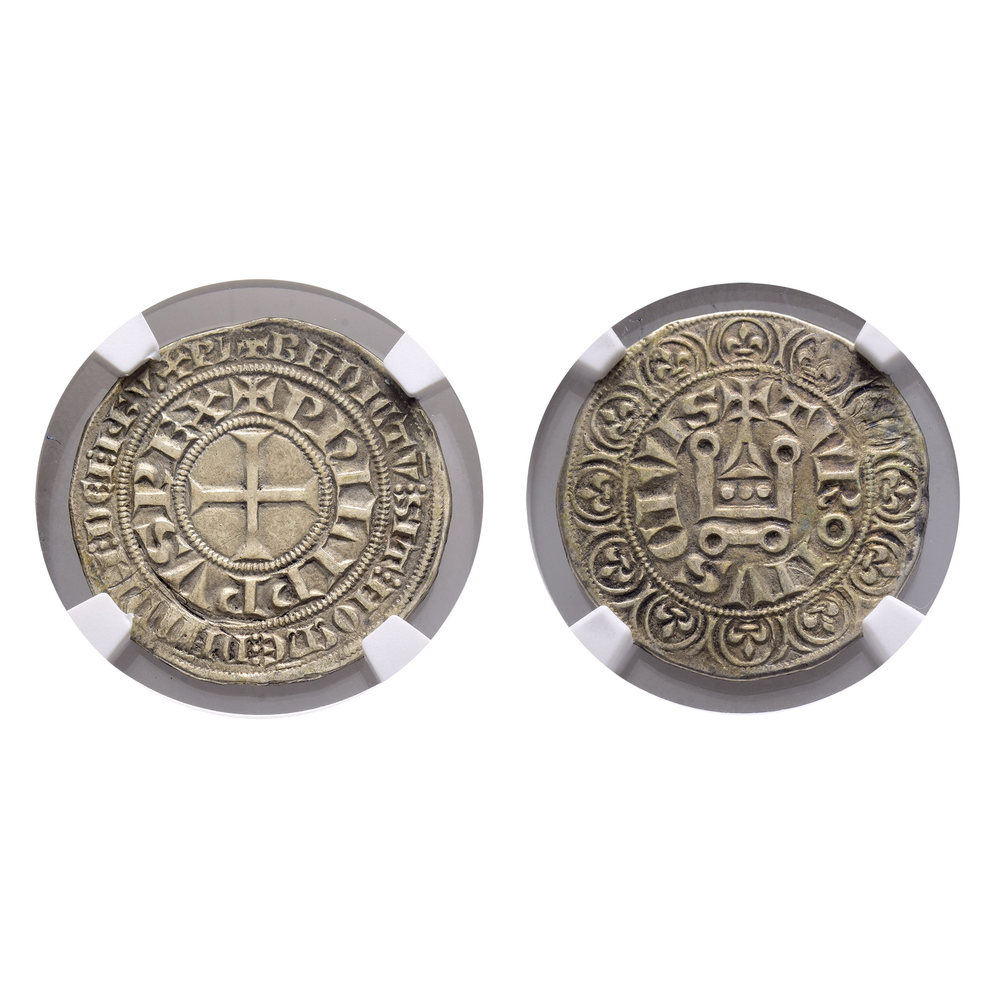 ✠ BHDICTV ⁝ SIT ⁝ HOᙏЄ ⁝ DHI ⁝ ꞂRI ⁝ DЄI ⁝ IҺV. XPI in outer margin, ✠ PҺILIPPVS REX in inner margin, short cross pattée / ✠ TVROHVS CIVIS around châtel tournois within border of twelve lis. NGC graded GENUINE (#8230595-016).